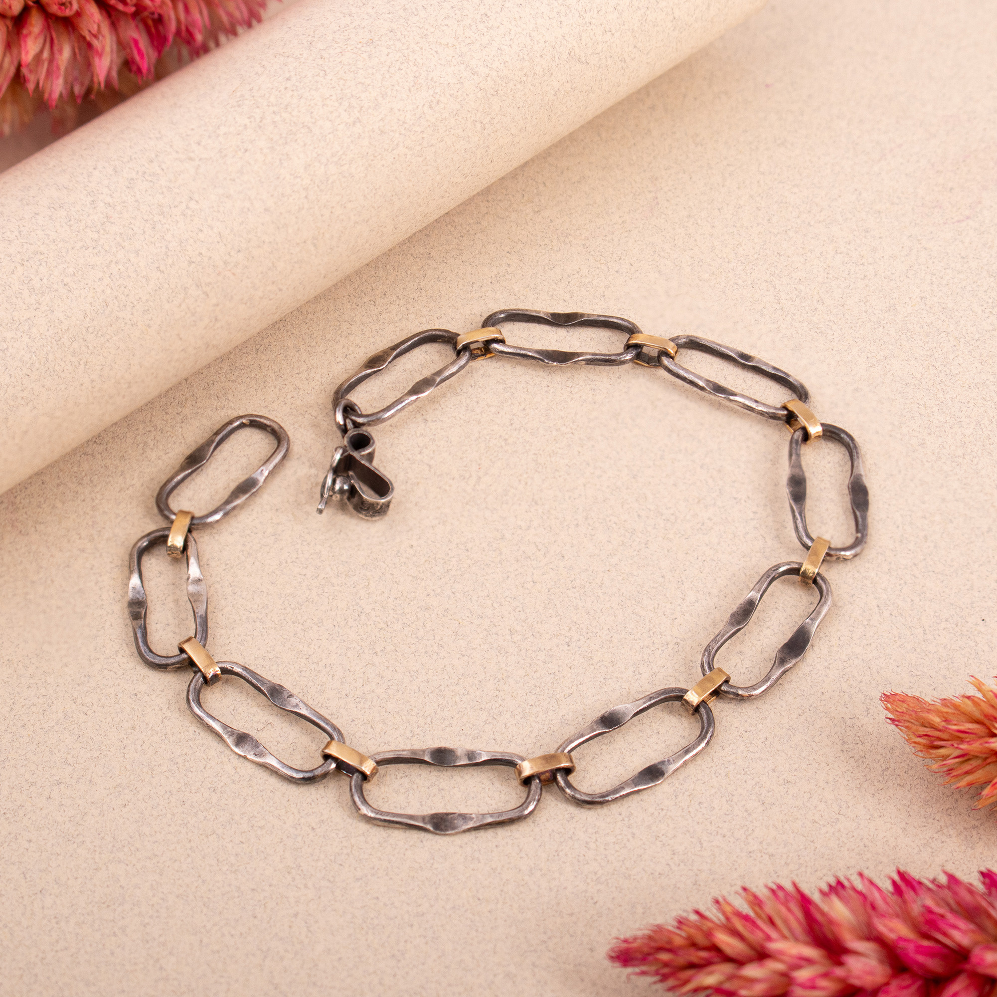 Hammered details bathed in 18k gold plating or enriched by an oxidized finish transform an accessory into a statement of power. Artisan Adriana de Gadea works with sterling silver to craft this chain bracelet, made for a dapper ensemble.