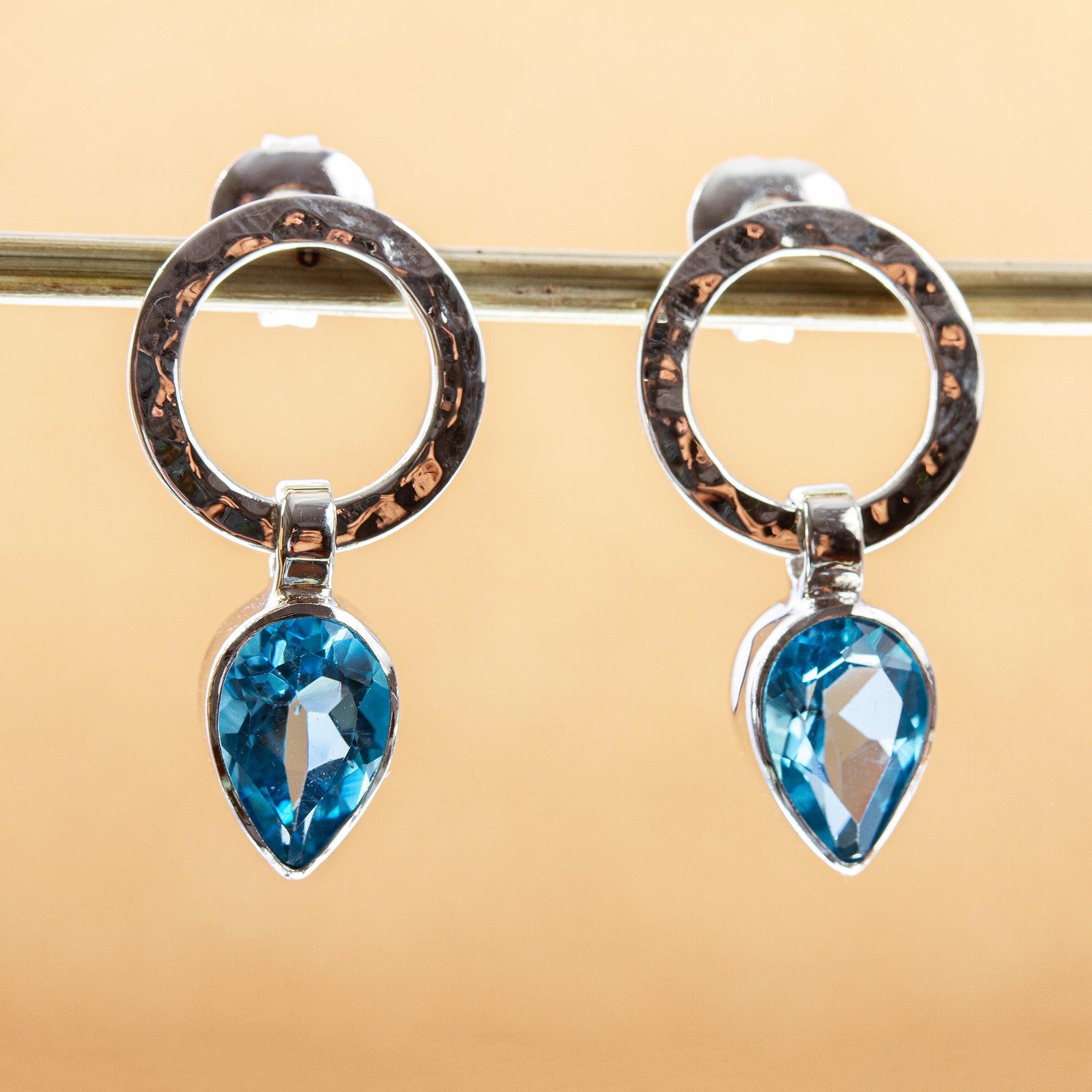 Scintillating droplets of sky-blue topaz are showcased in these earrings from Alon Diller in Mexico. The artisan crafts the drop earrings with Taxco 950 silver that has been hand-hammered to create rich texture.