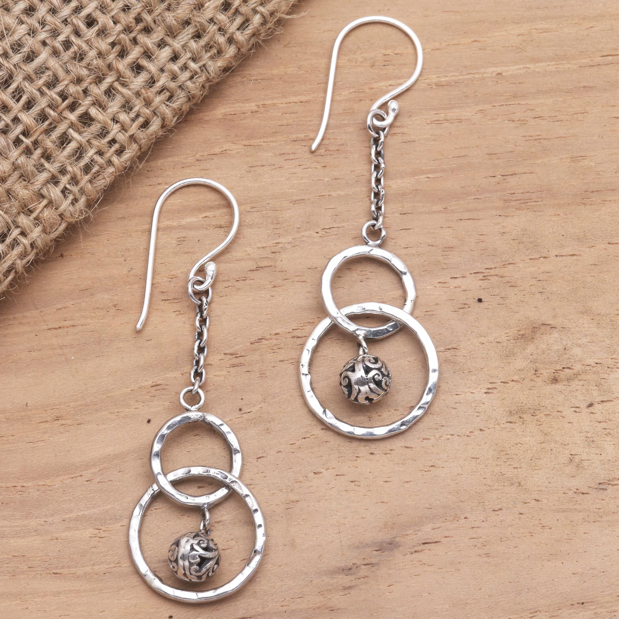 Create a sense of movement wearing these unique dangle earrings designed by Java's Rosalia Tarigan. The artisan suspends two interlocking sterling silver rings from a short chain, while a petite orb engraved with traditional Balinese designs hangs at the center of the lower ring.
