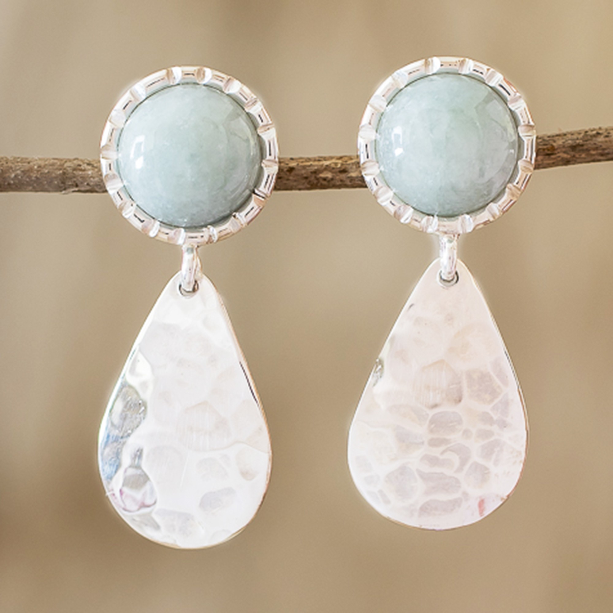 Hammered Sterling Silver and Jade Earrings, 'Maya Texture in Light Green'