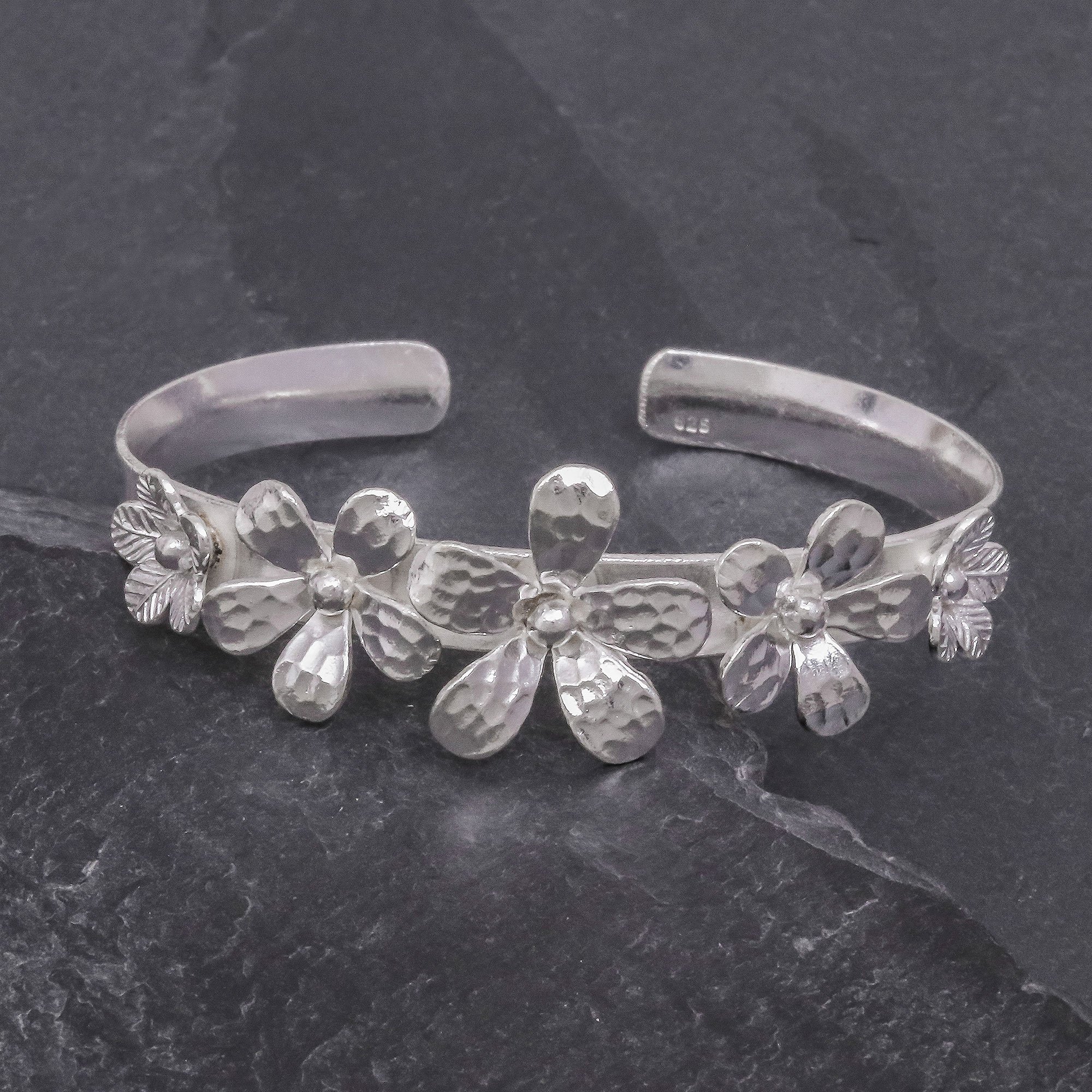 Hammered Sterling Silver Flower Cuff Bracelet, 'Blossom Row'