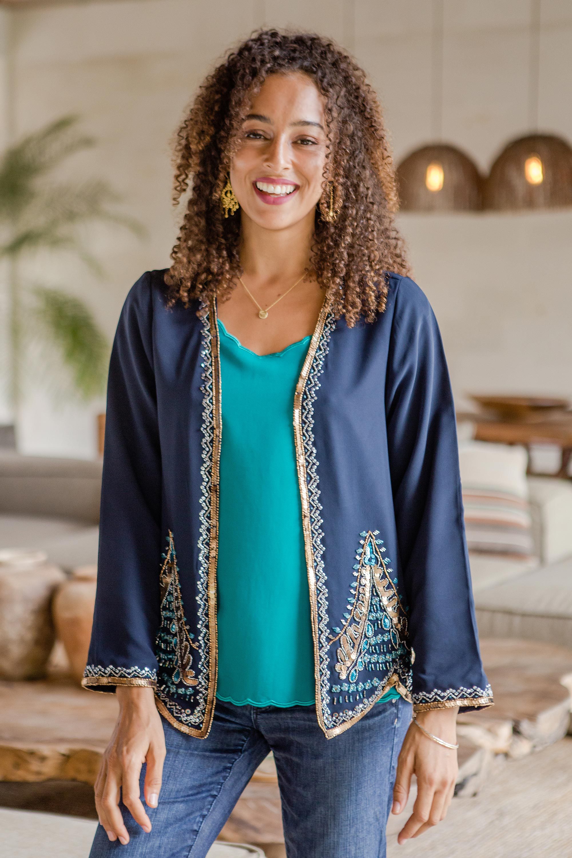 Hand-Beaded Open-Front Jacket from India, 'Glitz and Glamour in Blue'