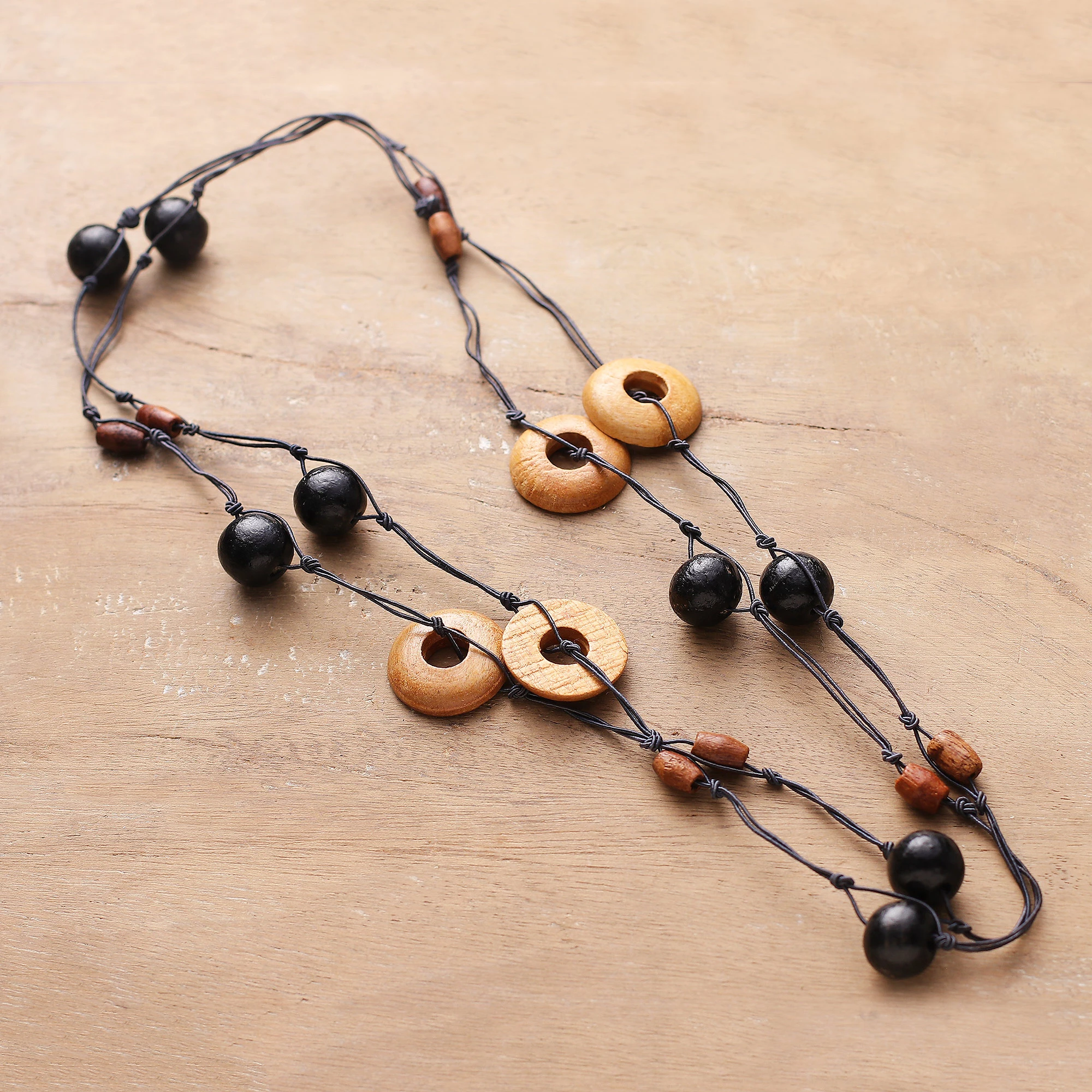 Hand-Carved and Painted Wood Beaded Long Station Necklace, 'Modern Delight'