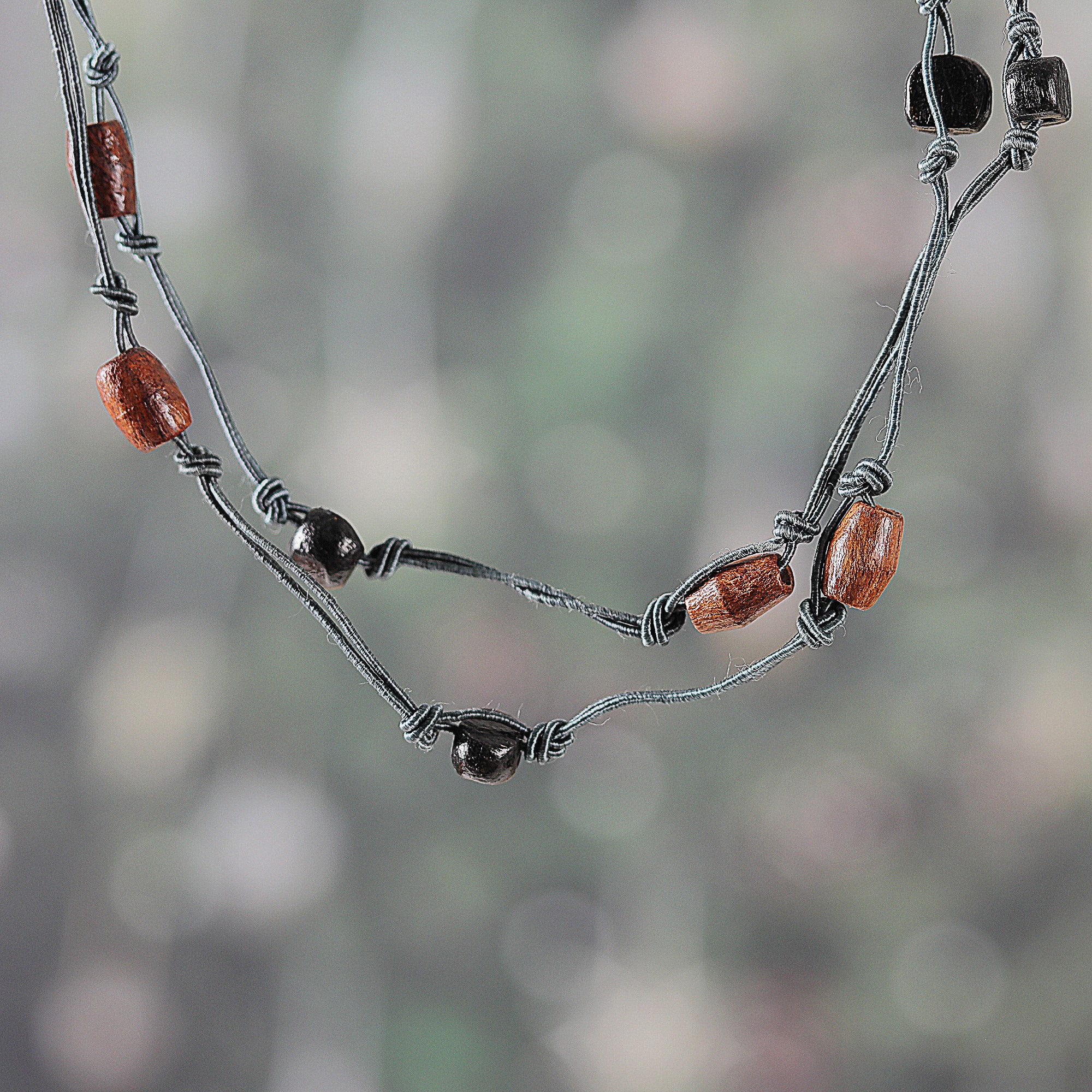 Hand-Carved Brown and Blue Wood Beaded Long Station Necklace, 'Exquisite Style'