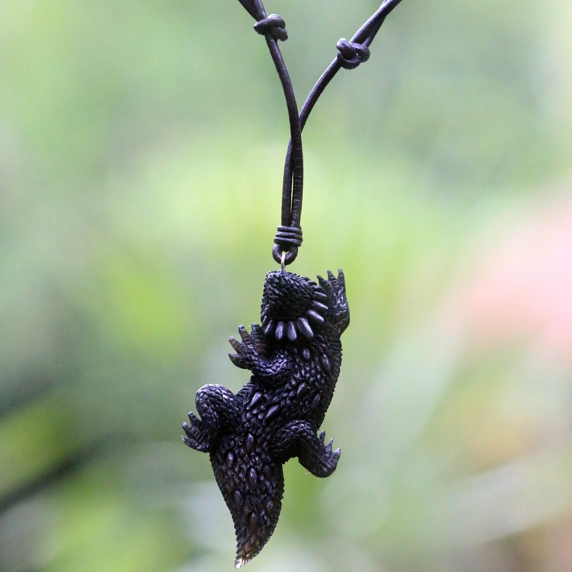 Artisan Made Wardika of the Bali and Java region of Indonesia introduces a unique offering in the world of alternative jewelry. Hand carved bone shapes this necklace's unique pendant, a tiny lizard known for its thorny spines that has earned it the nickname of both dragon and devil. This curious creature is dyed black and hangs from a dark brown leather cord featuring an adjustable sliding knot clasp.