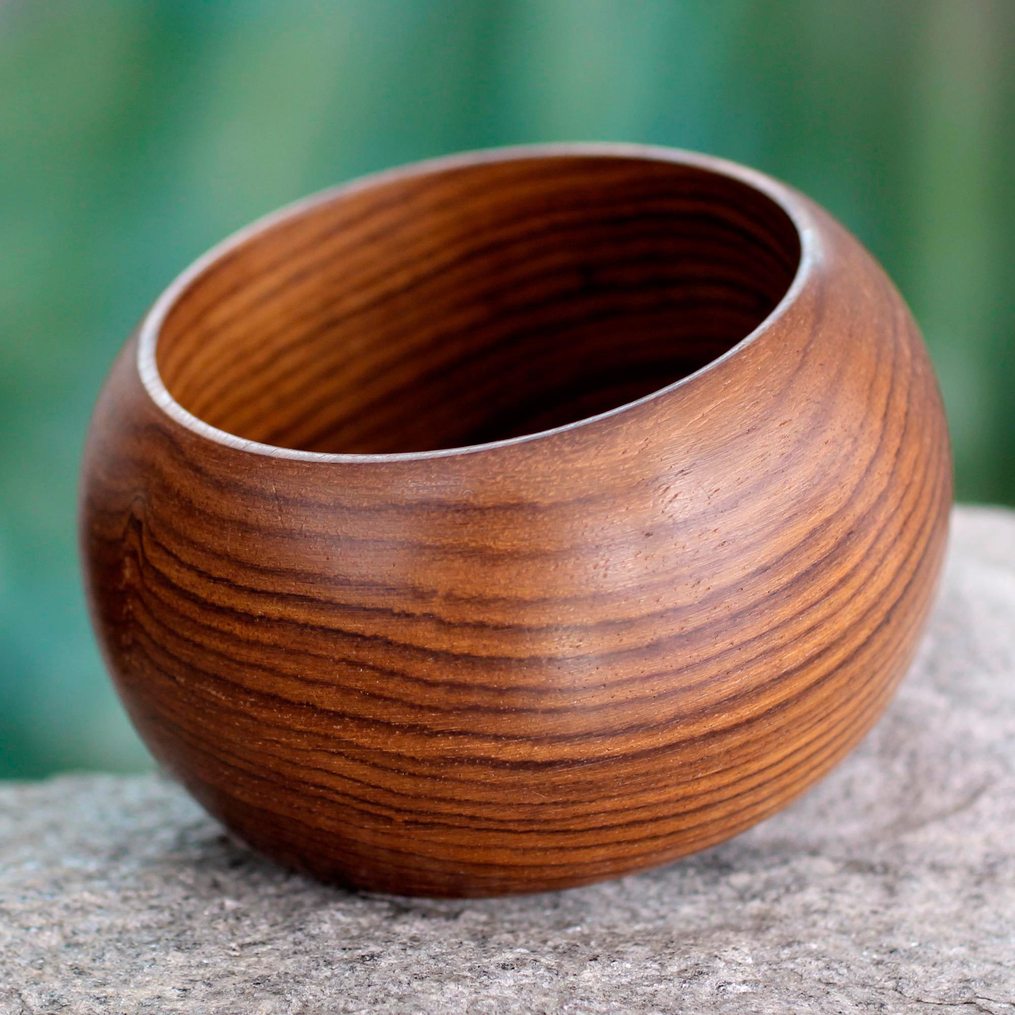 Featuring a rich natural grain with intricate lines, this bangle bracelet from India is carved by hand from a single piece of brown mango wood. Vipin presents this gorgeous accessory, which is diligently crafted by local artisans.