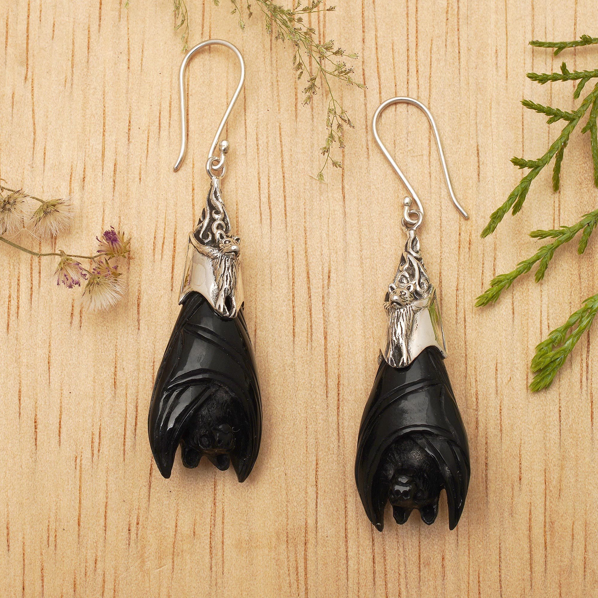 Bring a playful edge to any outfit with these captivating dangle earrings showcasing bat motifs intricately carved from horn. Suspended from sterling silver hooks, the detailed design, crafted by Balinese artisan Ayu Ary, creates a bold accessory that's sure to stand out.