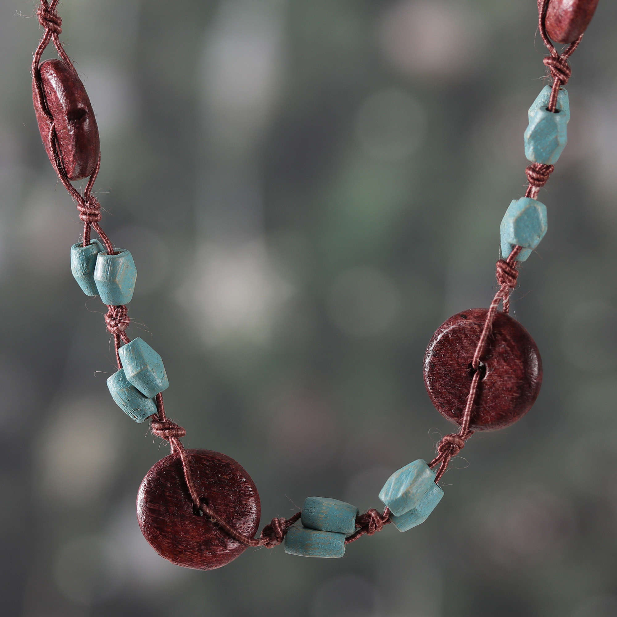 Hand-Carved Wood Beaded Long Necklace in Brown and Aqua Hues, 'Graceful Fusion'