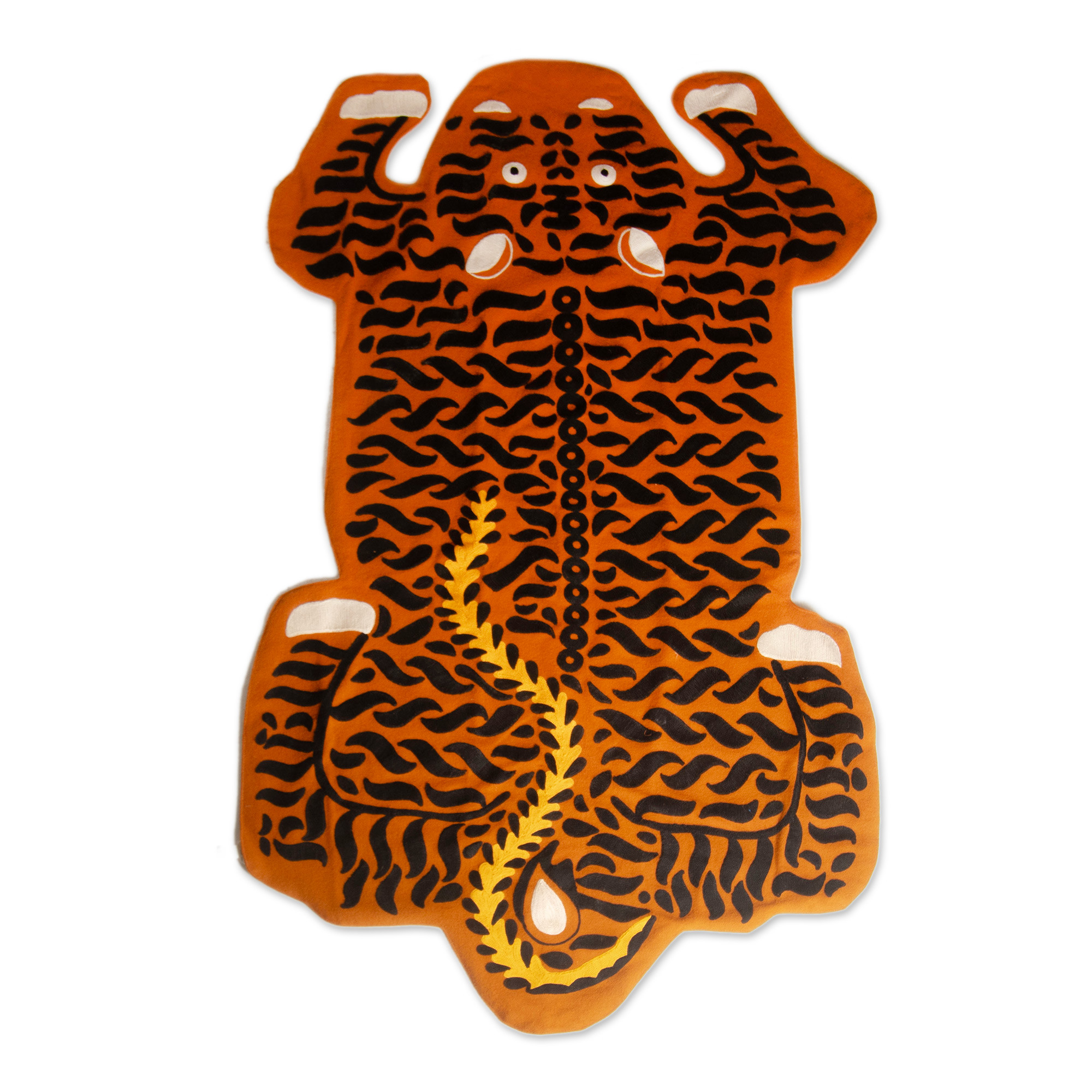 Not every room has a wild side, but yours is about to. This eye-catching wool area rug takes the form of a prowling tiger, its body alive with intricate traditional Indian chain-stitch embroidery that transforms every stripe and sinew into a feat of needle and thread. Backed in cotton and shaped to follow every contour of the animal, it sprawls across any floor with the kind of fearless confidence that makes guests stop mid-sentence. Designed by Amit Moza, it is less a rug you walk on and more a conversation that lives on your floor.
