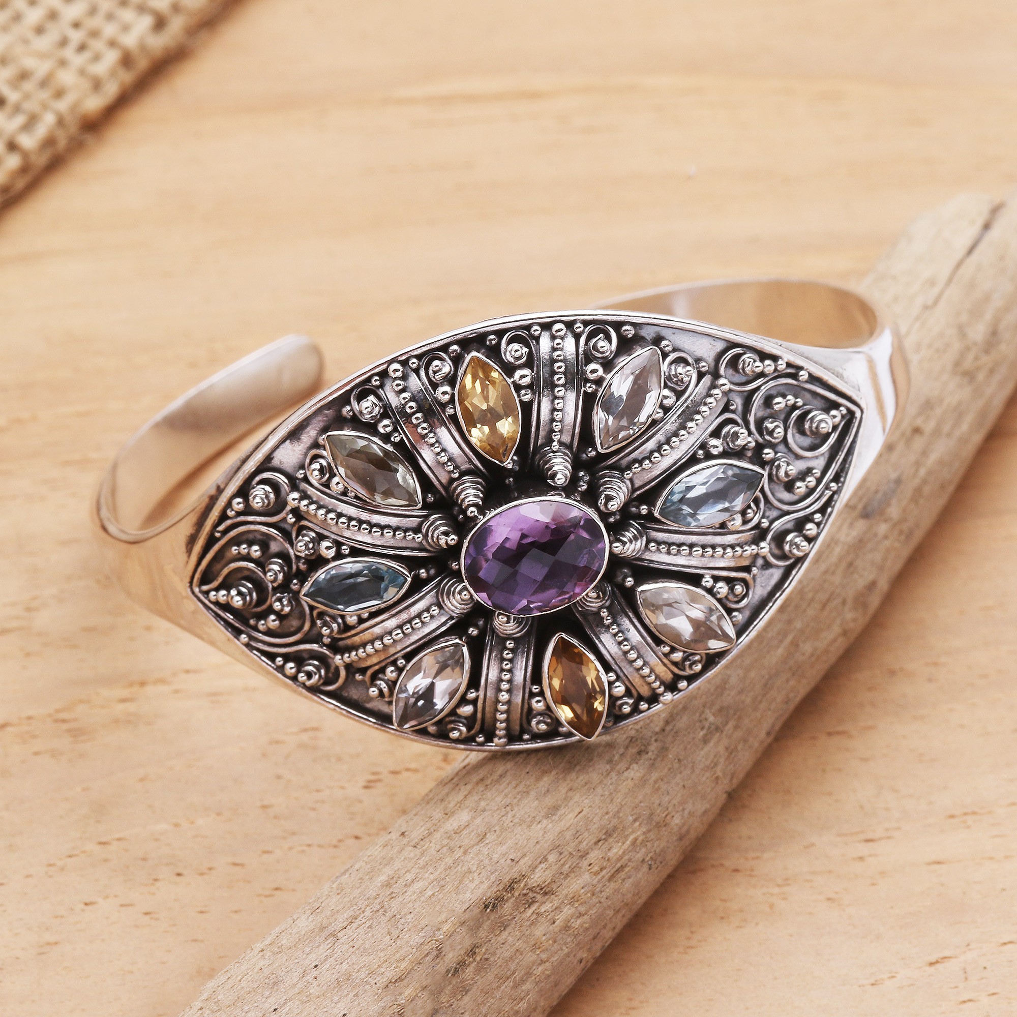 A round amethyst in a bezel setting sparkles at the center this stunning cuff bracelet from Bali's Dewi Putera. Marquise-shaped citrine, blue topaz, and quartz circle the amethyst, while ornate sterling silver designs add an elegant touch.