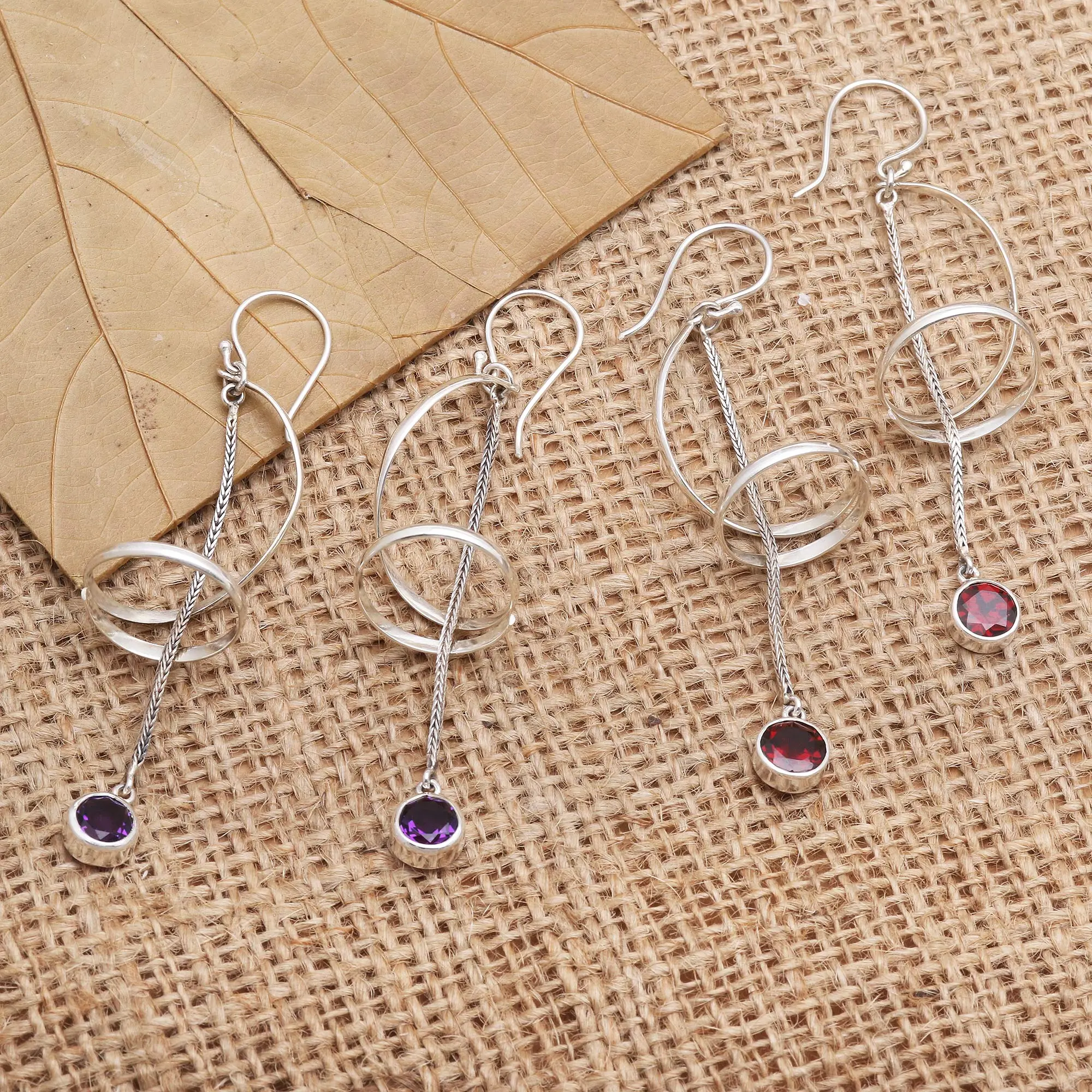 You'll instantly stand out from the crowd with Ita Puspita's unique earrings. Choose between rich purple amethyst or deep red garnet stones the artisan places in bezel settings at the bottom of the earrings. The gems hang from sterling silver foxtail chains, which the artisan threads through open spirals of sterling silver.