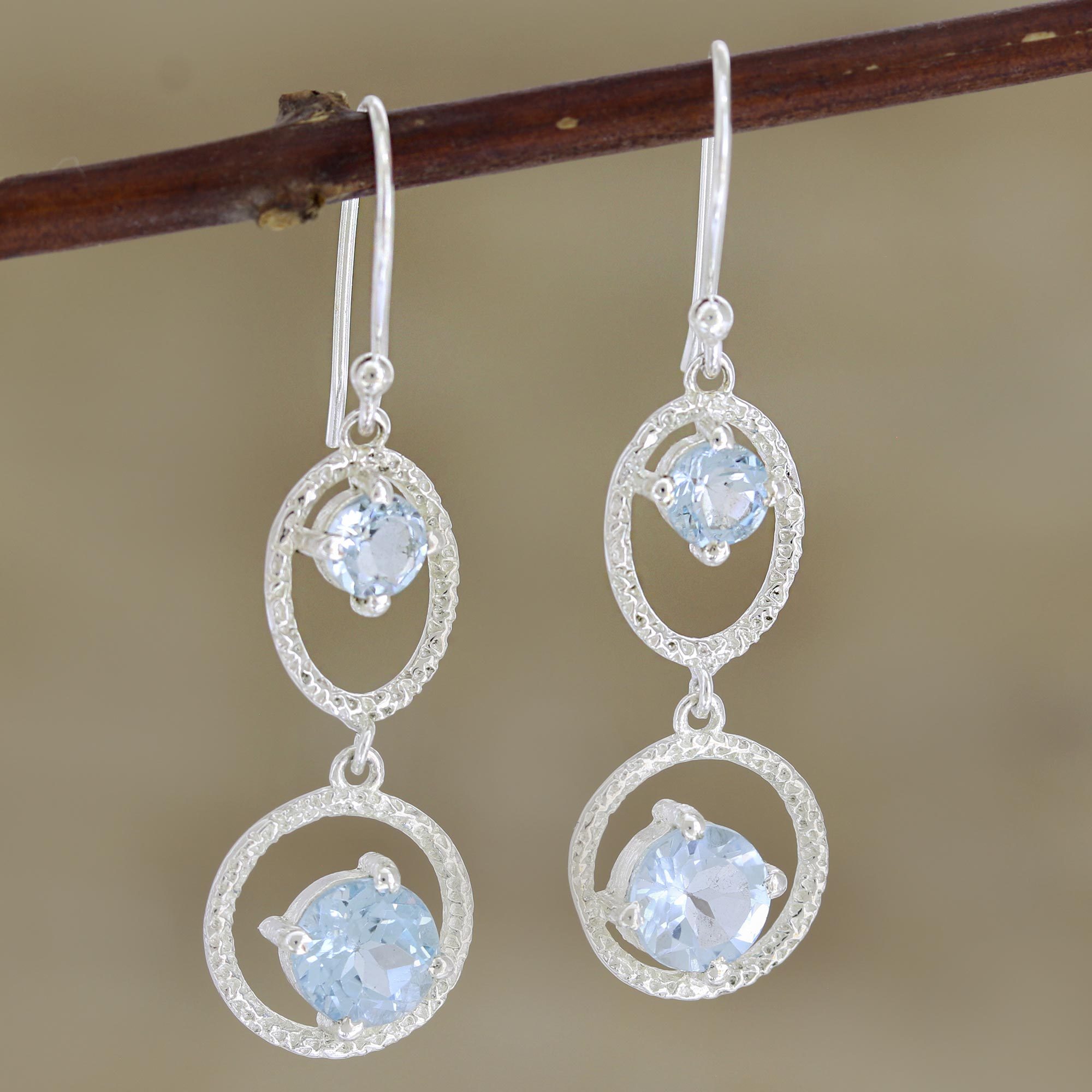 Capture the magic of a winter romance with these pale blue earrings from India's Chintan. Joined by a tiny silver link, two sterling silver hoops frame a pair of faceted blue topaz gemstones that sparkle in the light. The hoops dangle elegantly from cool, sterling silver hooks.