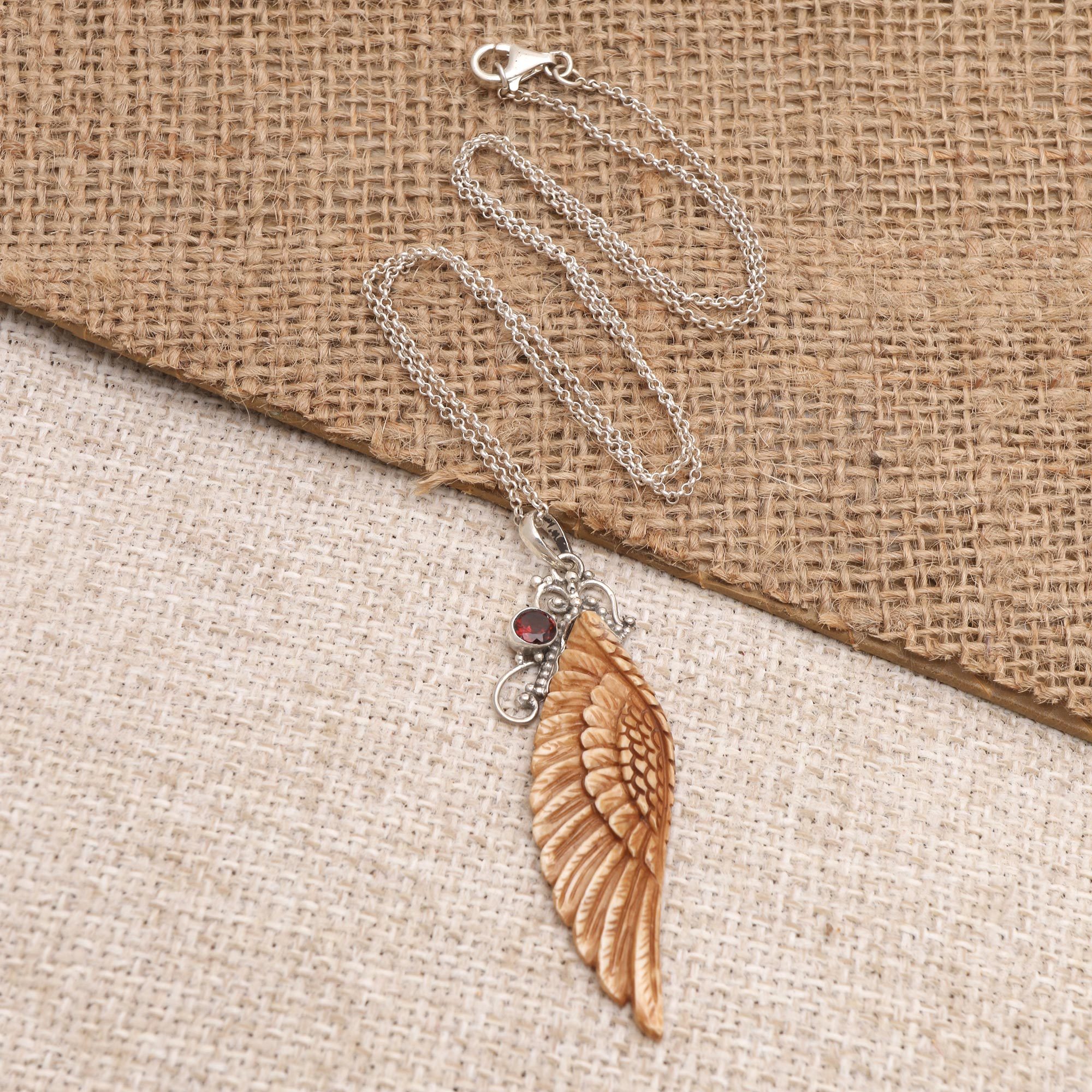 Made Wardika's ethereal pendant necklace will bring out the angel inside of you. The Balinese artisan hand carves a piece of natural bone into a glorious angel's wing, then accents his creation with a single round garnet gem in a bezel setting. A sterling silver rolo chain and decorative accents shine like the heavens above.