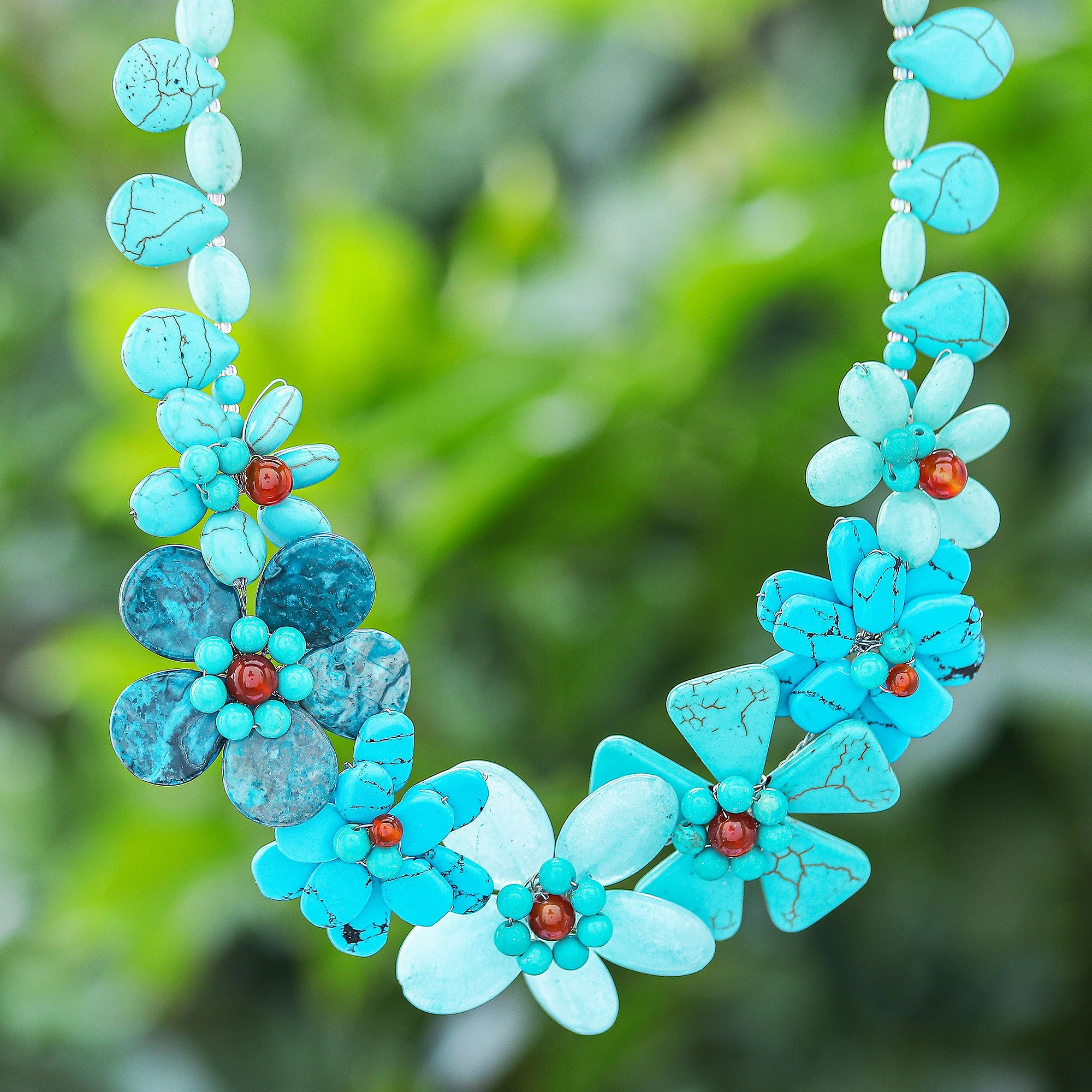 Punctuated by bright orange chalcedony, the cool gemstones on Nareerat's pendant necklace vibrate with color. The Thai artisan uses stainless steel to create a prominent floral motif, skillfully wrapping wire around howlite, quartz, and jasper gems. Clear glass beads reflect the light, while a sterling silver-plated brass clasp provides the finishing touch.