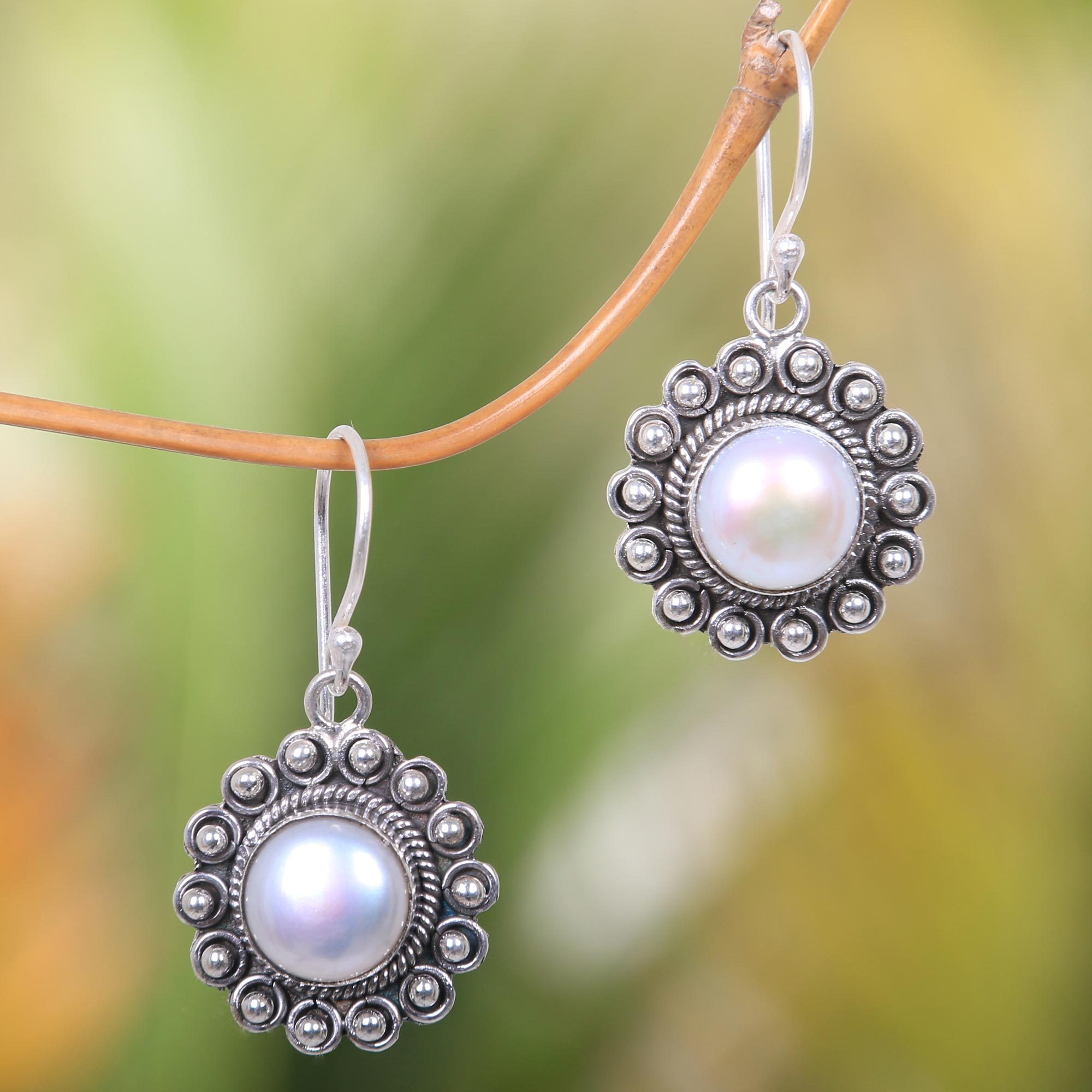 Hand-Crafted Cultured Pearl and Silver Earrings Sun Shaped, 'Strong Sun'