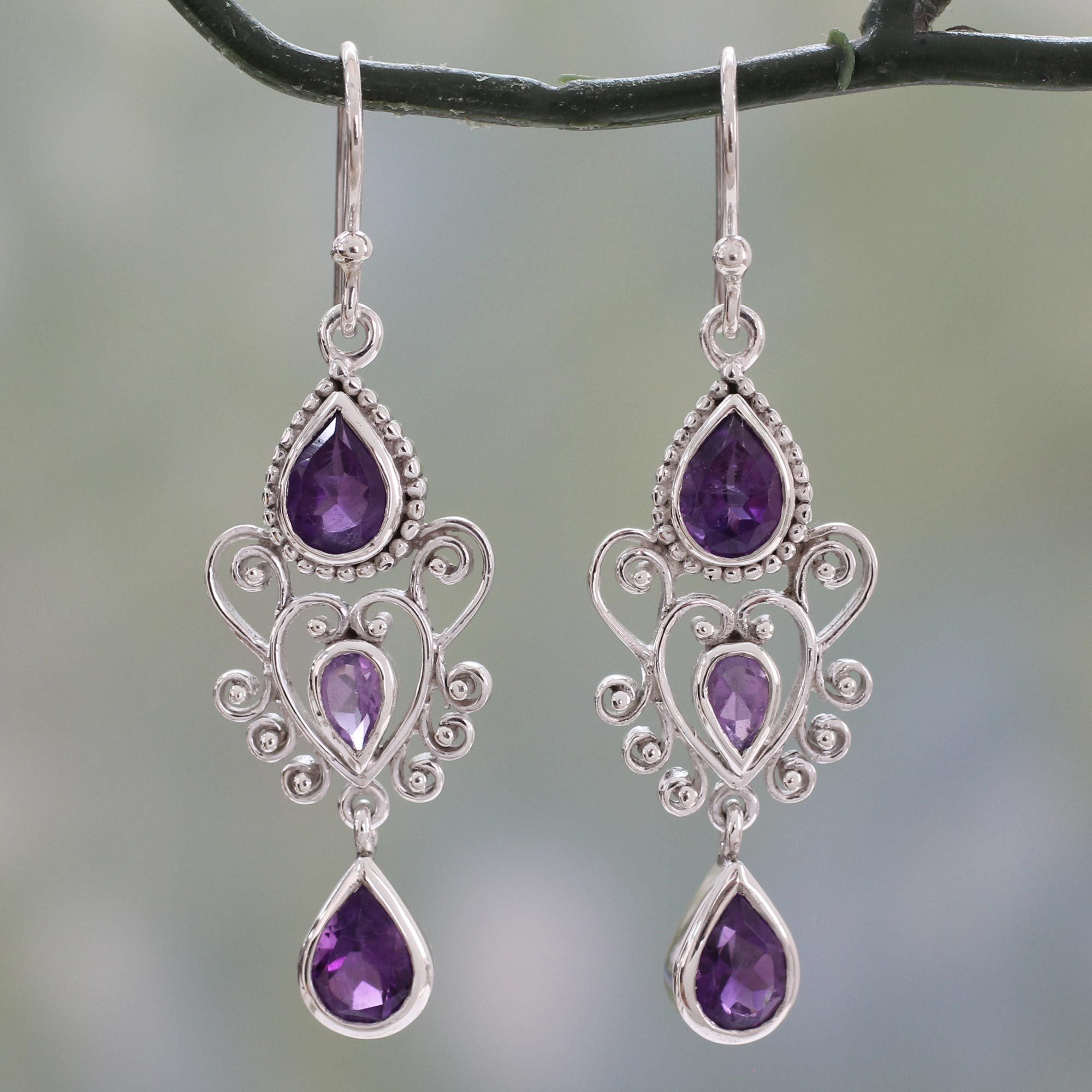 Cast your own spell of enchantment with these mesmerizing earrings from India's Shubhra Singh. Elaborate heart-shaped motifs in sterling silver are flanked top and bottom by teardrops of amethyst. The dangle earrings feature over 3 carats of the lilac-hued gemstone, including smaller teardrops at the hearts' centers. The earrings sway on sterling silver hooks.