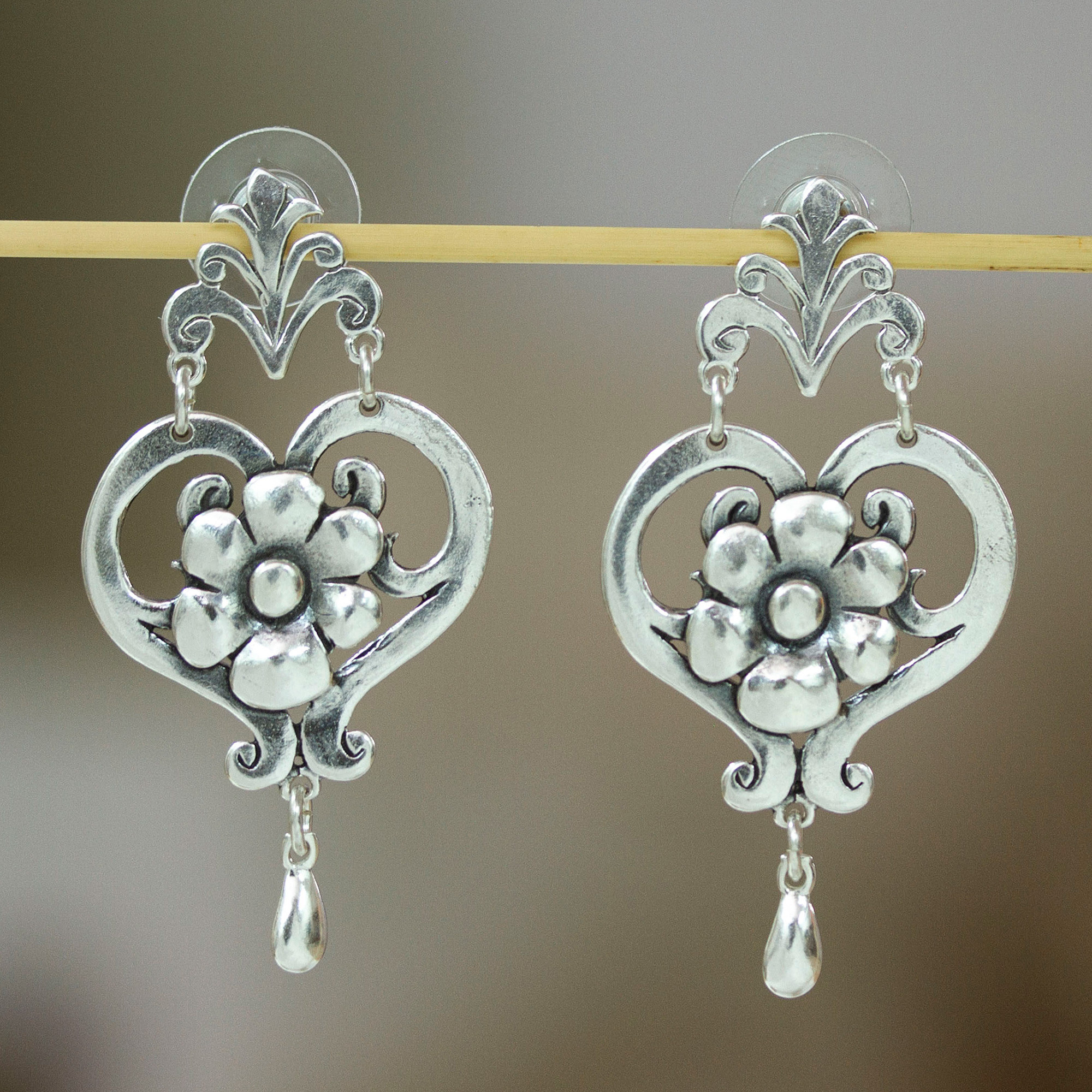 Hand Crafted Floral Sterling Silver Dangle Earrings, 'Daisy Hearts'