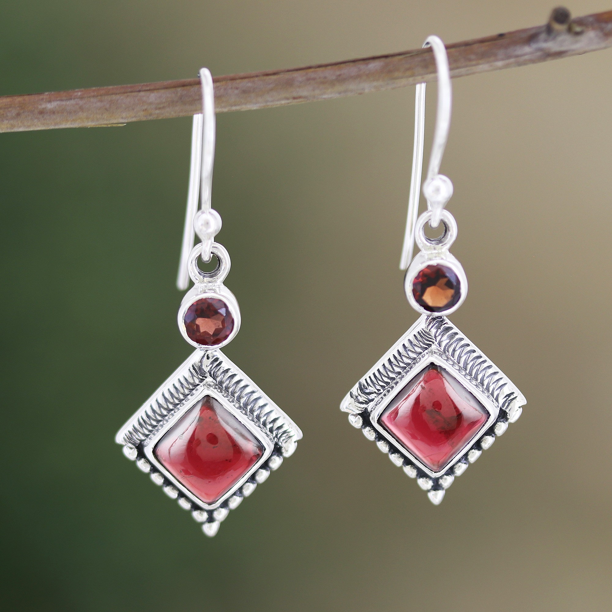 Presented by Neeru Goel, these exquisite dangle earrings harness the power of garnet to inspire love and devotion. Indian artisans use two garnet gems--one smooth, one faceted--in bezel settings to hand craft each earrings, while sterling silver accents shine.