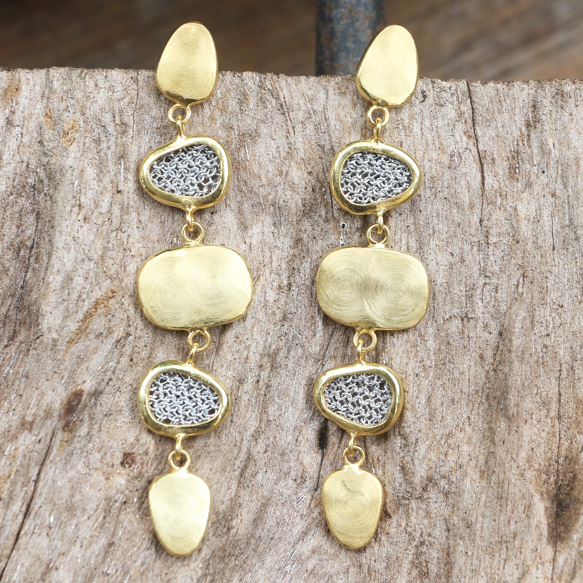 A row of shining gold shapes dazzle in these elegant dangle earrings designed by Ayu Widiani and crafted by Balinese artisans. Connected by tiny links, the 18k gold-plated brass shapes alternate with fine polyester mesh shapes framed in gold-plated brass.