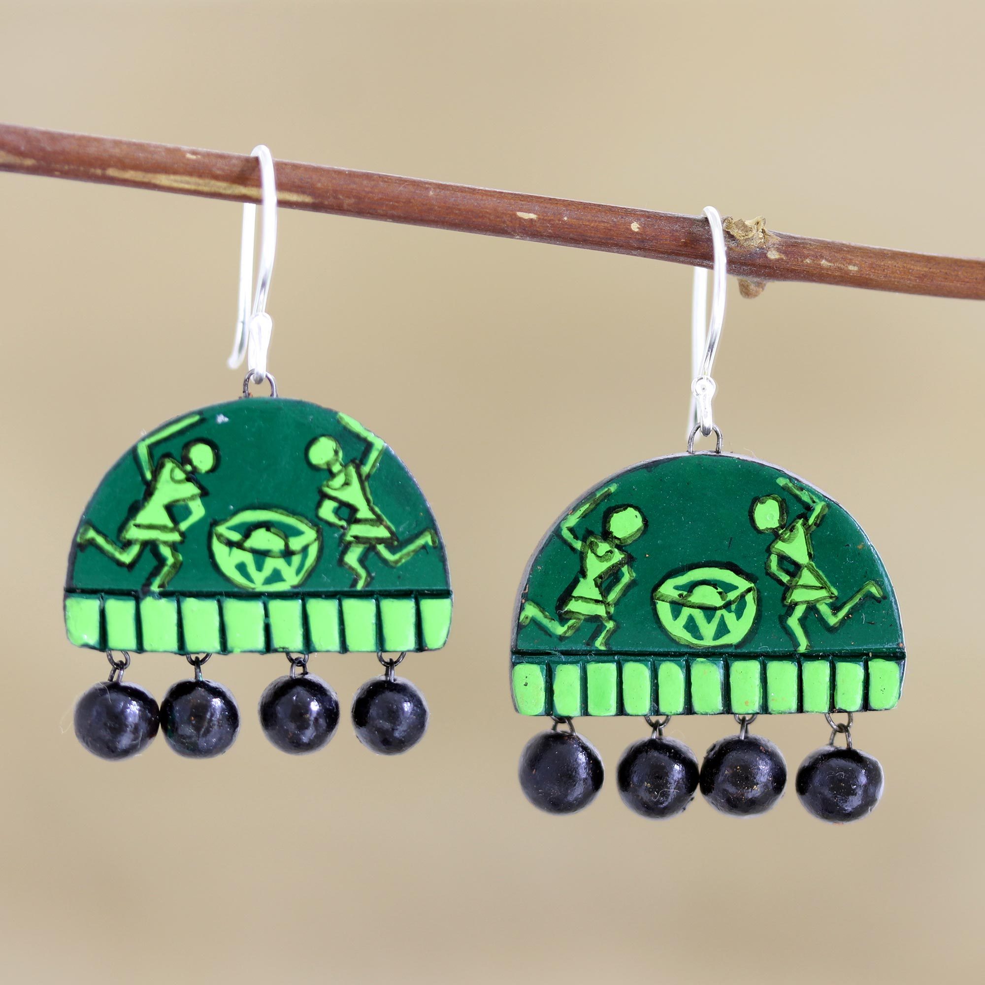 Two dancing drummers beat joyfully on a single drum at the center of these fun dangle earrings designed by Indian artisan Ritu Thapar. Each earring is crafted from terracotta, then hand painted in contrasting shades of light and dark green. The artisan finishes the earrings with dangling black beads, a glossy lacquer, and gleaming sterling silver hooks.