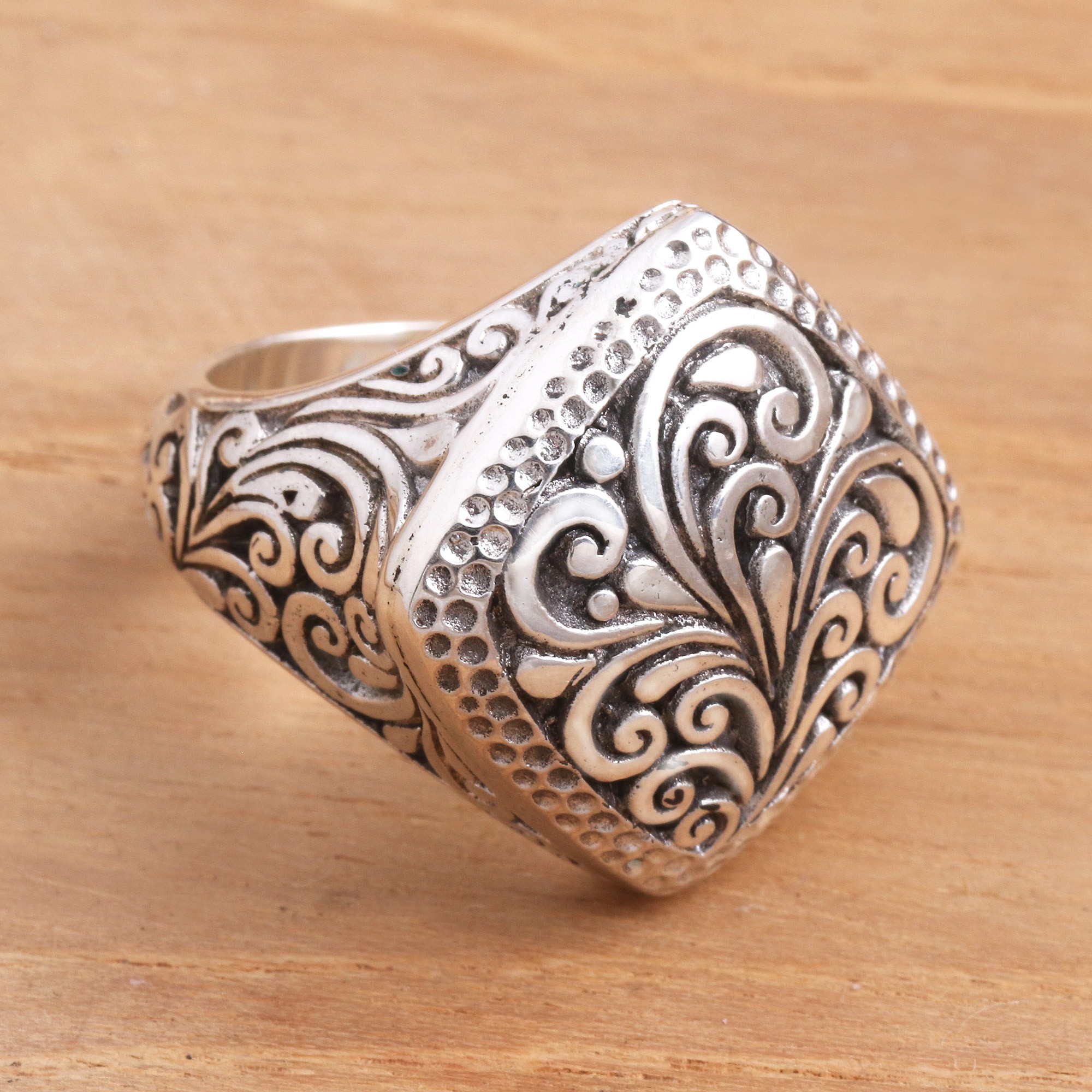 Designed by Rosalia Tarigan, this signet-style ring showcases traditional Indonesian-style silver work. The impressive sterling silver ring features a stippled square crown with ornate swirls and flourishes. Additional motifs adorn the sides of the ring.