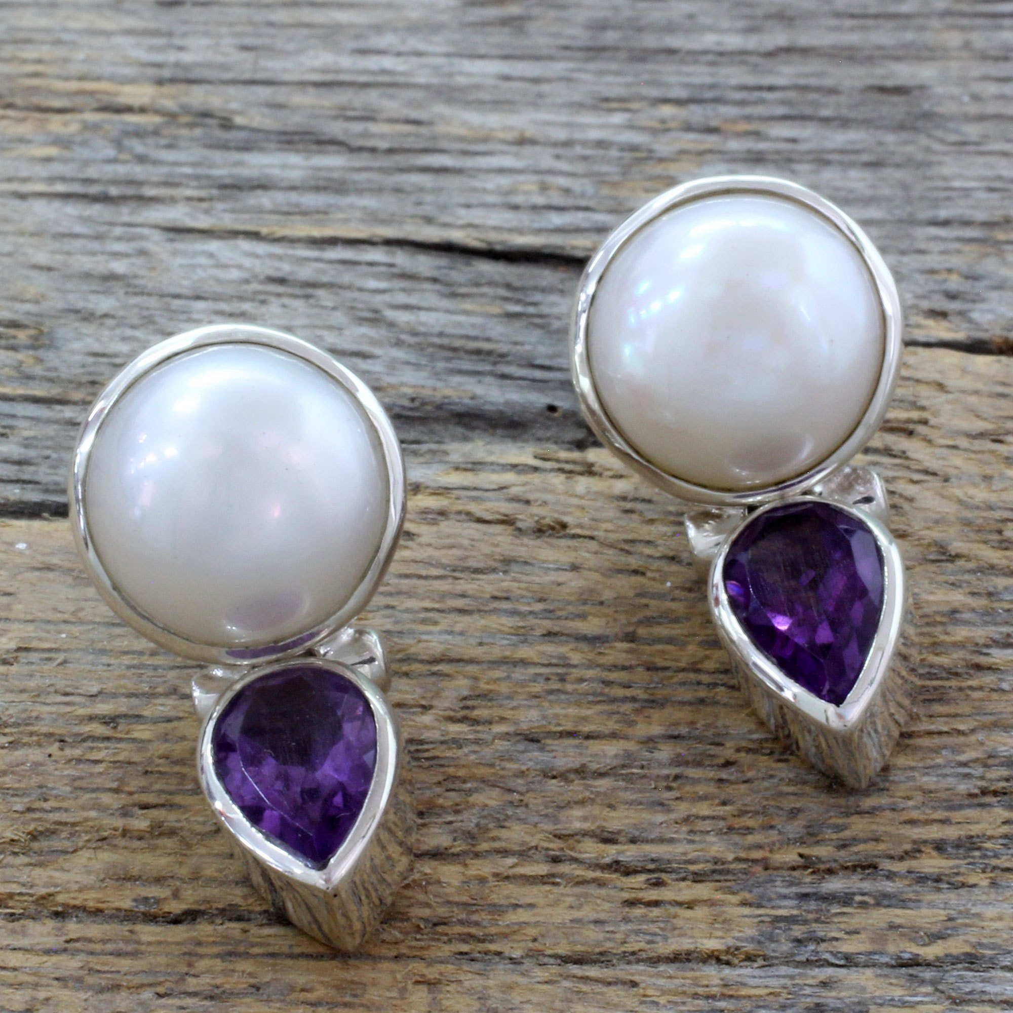 Hand Crafted Pearl and Amethyst Earrings from India, 'Flirting Moons'