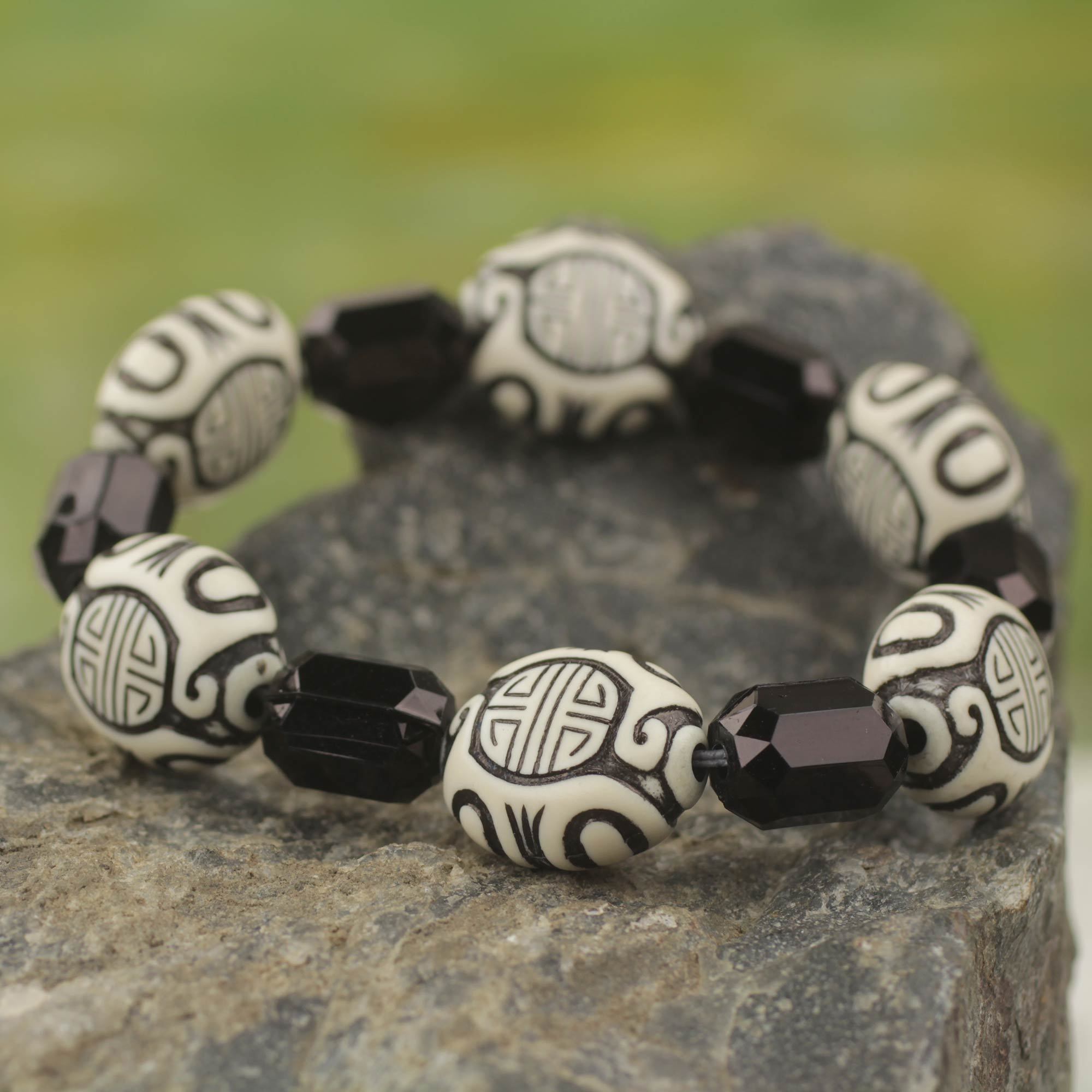 Black and white stand in a beautiful and bold contrast in this unique beaded stretch bracelet presented by Rita Addo Zakour. Ghanaian artisans melt recycled plastic drinking bottles, dye the liquid, and pour it into molds to create each individual bead.