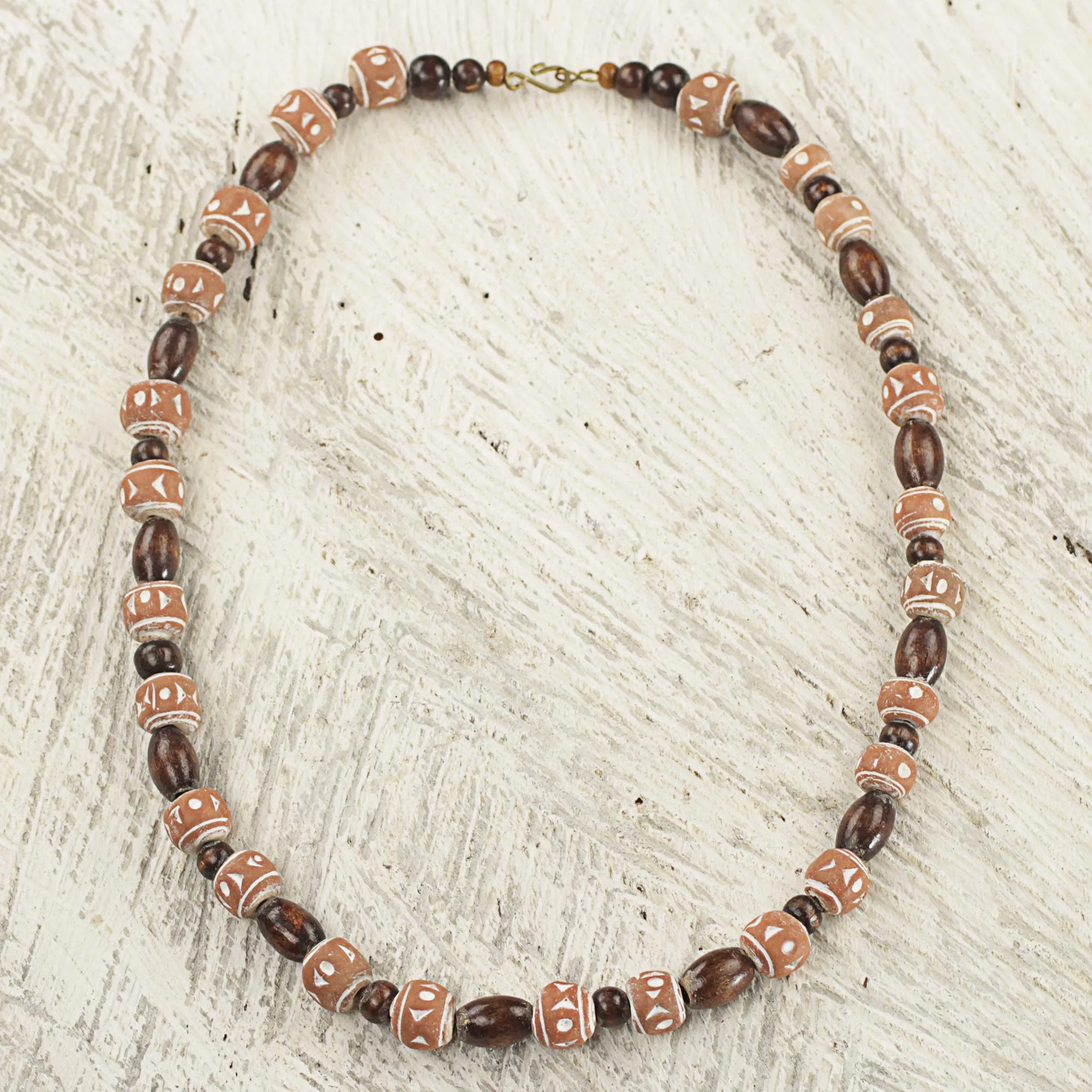 Hand Crafted Sese Wood and Terracotta Beaded Necklace, 'Oheneyire'