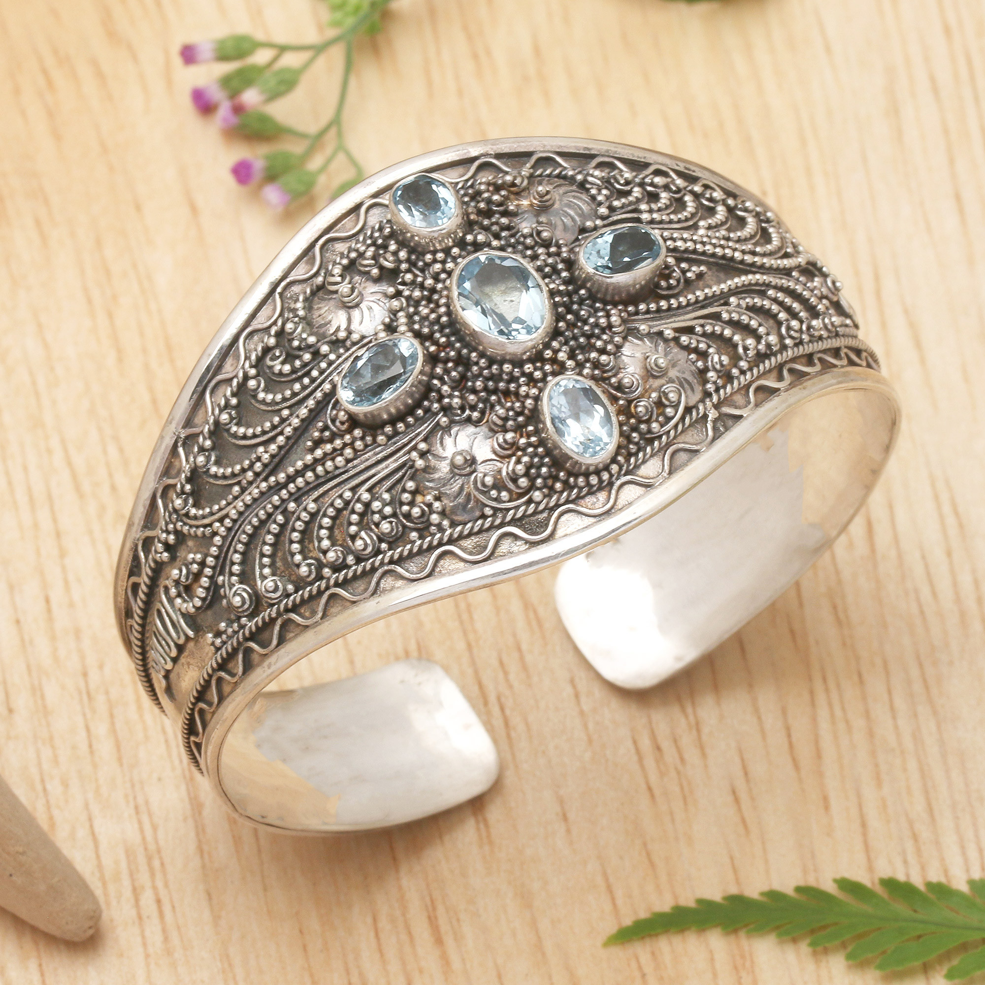 From the inspired mind of Balinese artisan Yuniati comes this spectacular blue topaz bracelet. The cuff features an intricate bun and jawan motif while gemstones totaling two carats resemble a compass in the center. Sure to be envied, the sterling silver bracelet adds an exclusive touch to any collection.