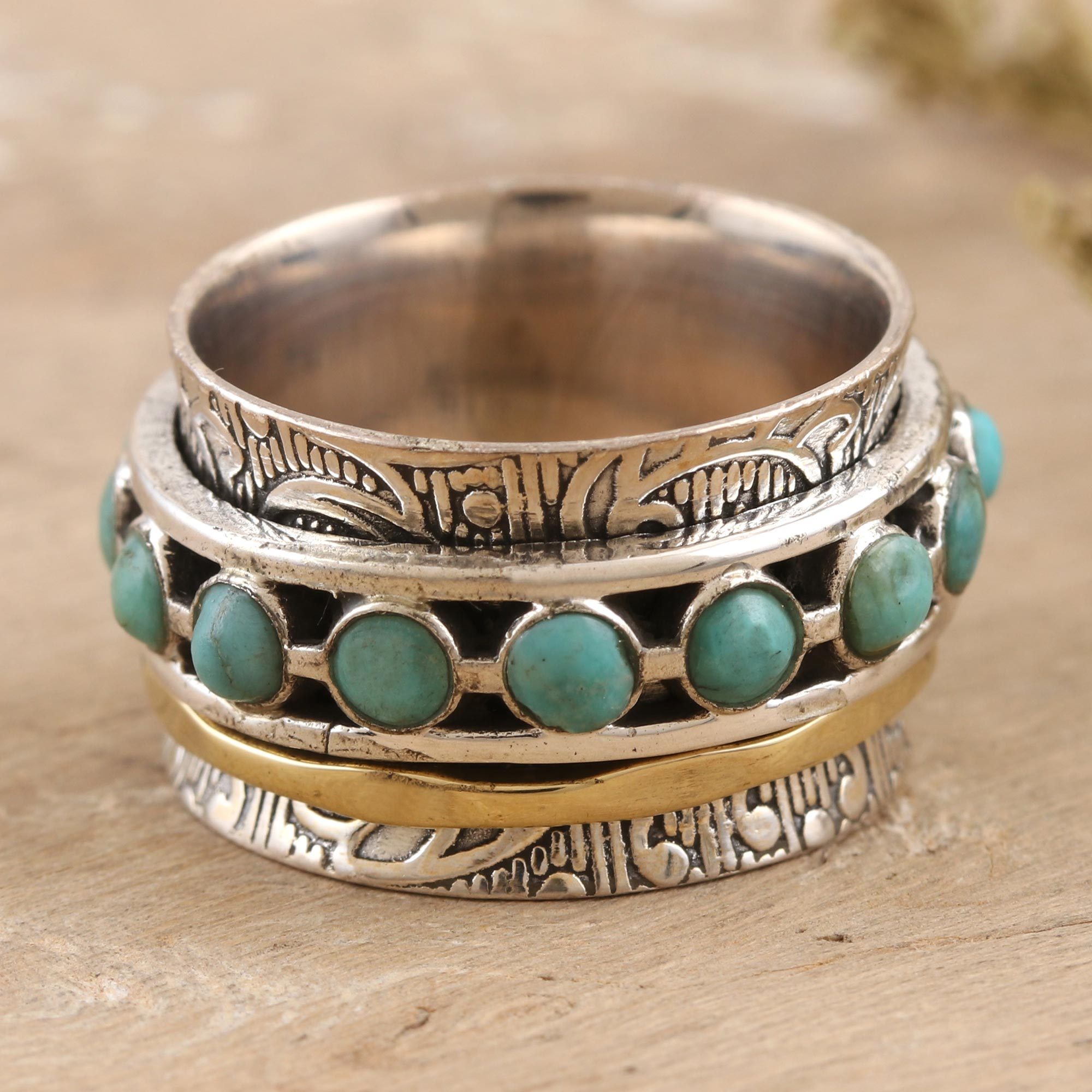 Keep your head cool in a crisis with Shivani Choudhary's meditation ring. Indian artisans hand craft the ring from sterling silver, fashioning a central spinning band encrusted with reconstituted turquoise gemstones. Engraved designs and a shimmering brass accent give the ring irresistible details.