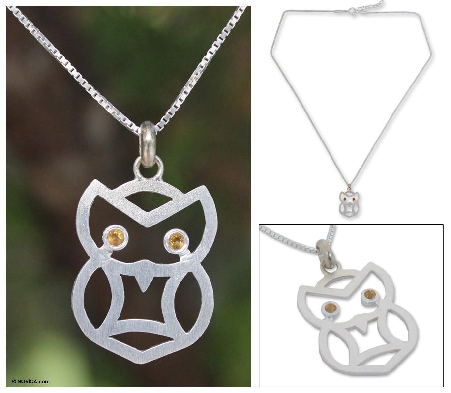 Said to bring about clarity of thought, faceted citrine gems glisten as the bright eyes of a wise owl. Jantana selects the dazzling gems for the design of this hand crafted sterling silver necklace.