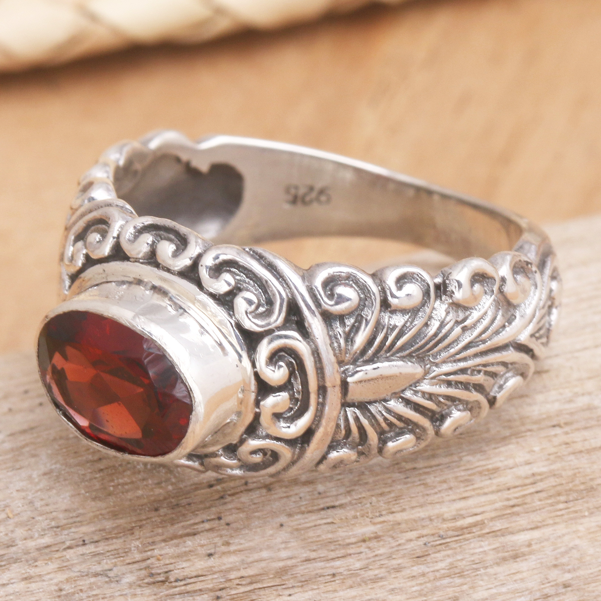 Replete with Balinese styling, this ring by Kenari is admirable. Garnet crowns the florid design of the ring, which is crafted of sterling silver featuring oxidized contrasts.