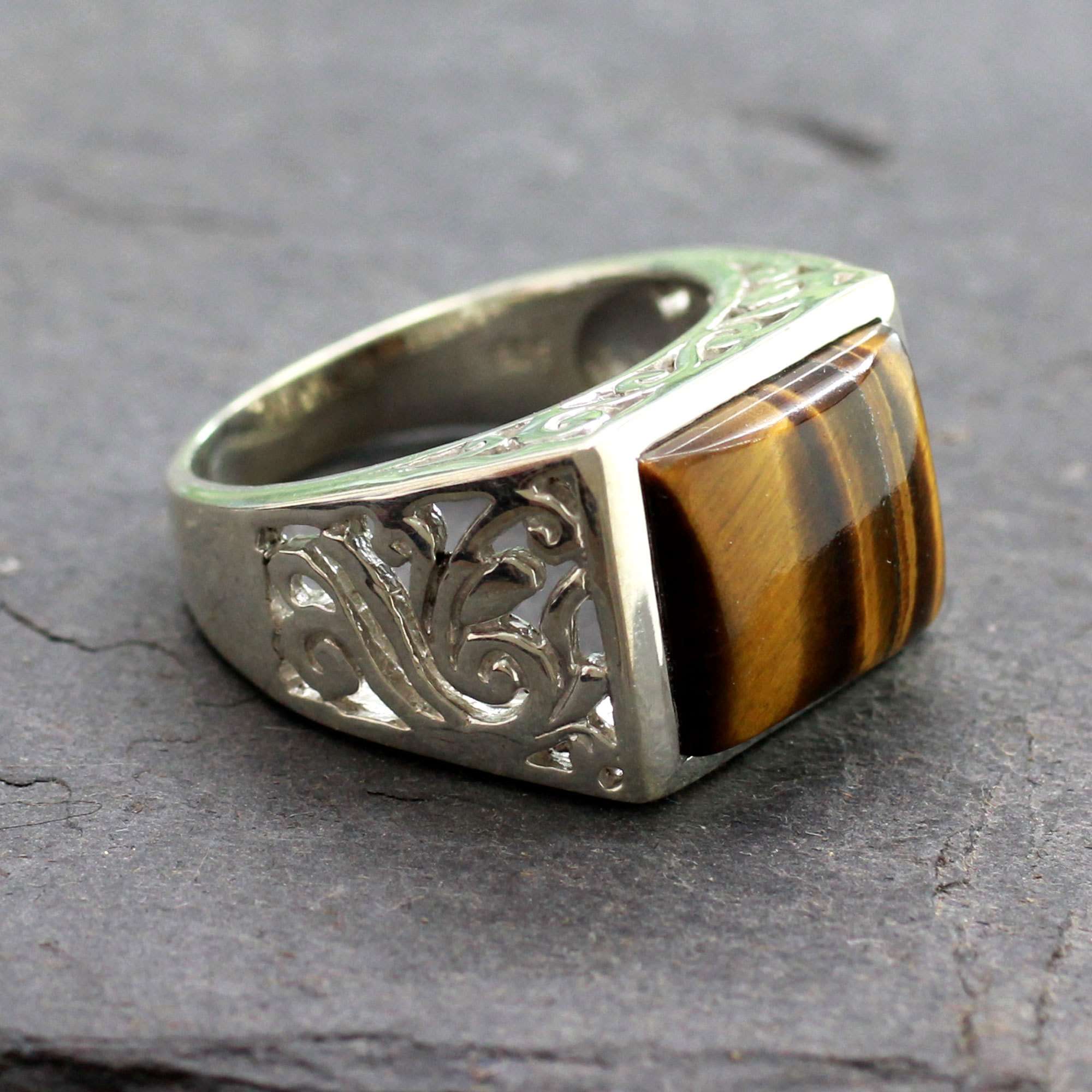 Sterling tendrils flank polished tiger's eye in a distinguished ring for men. From Alok Jain, this design is meticulously crafted by hand of sterling silver.