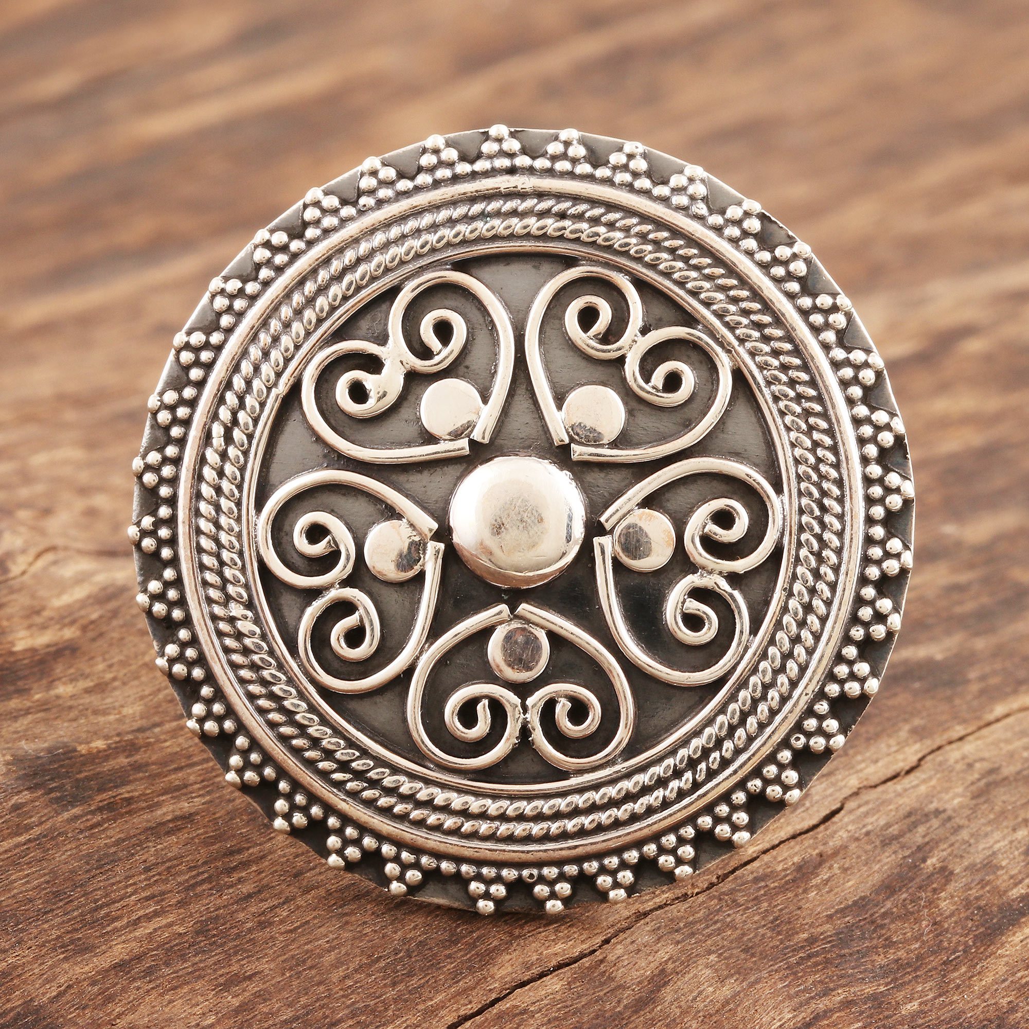 An impressive circular cocktail ring from India's Ajay Patil shines in oxidized sterling silver. The artisan uses precise dot work, or rawa, to accent a ring of alluring heart-shaped flowers at the ring's center. The ring is finished with an adjustable band for versatility.