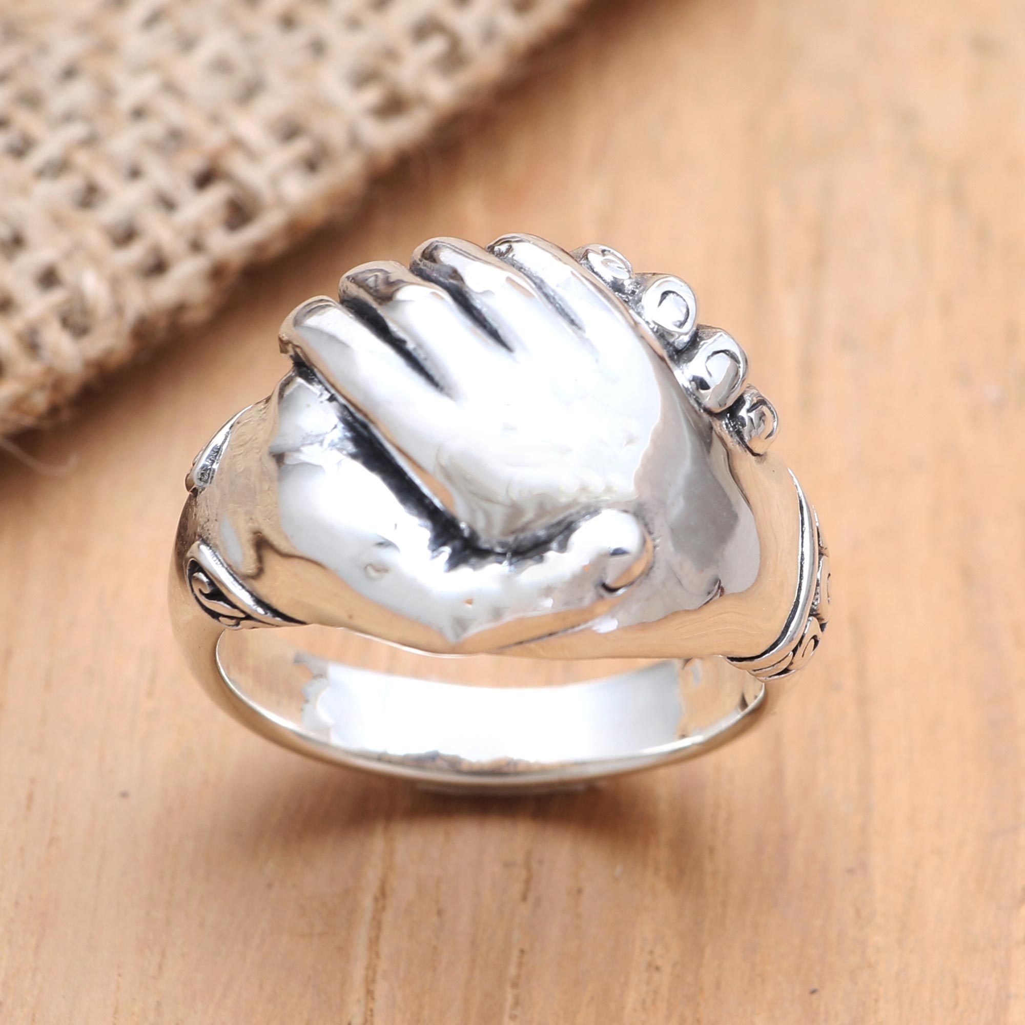 Exude an attitude of humility and grace with this intriguing cocktail ring designed by Bali's Dewa Arimbawa. Crafted from polished sterling silver, the ring features two clasped hands that represent understanding and forgiveness between the shakers.