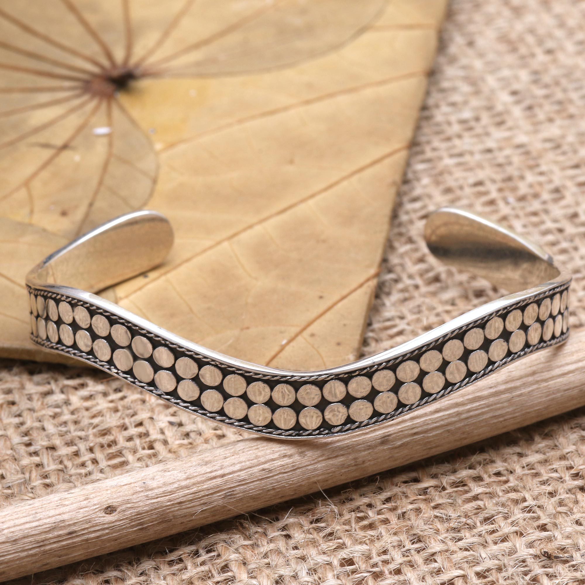Effortlessly elegant, Nyoman Ariawan's cuff bracelet is the only thing you'll need to take your outfit to the next level. The Balinese artisan crafts the undulating bracelet from sterling silver, embellishing the top with polished silver dots that twinkle between braided silver ropes.