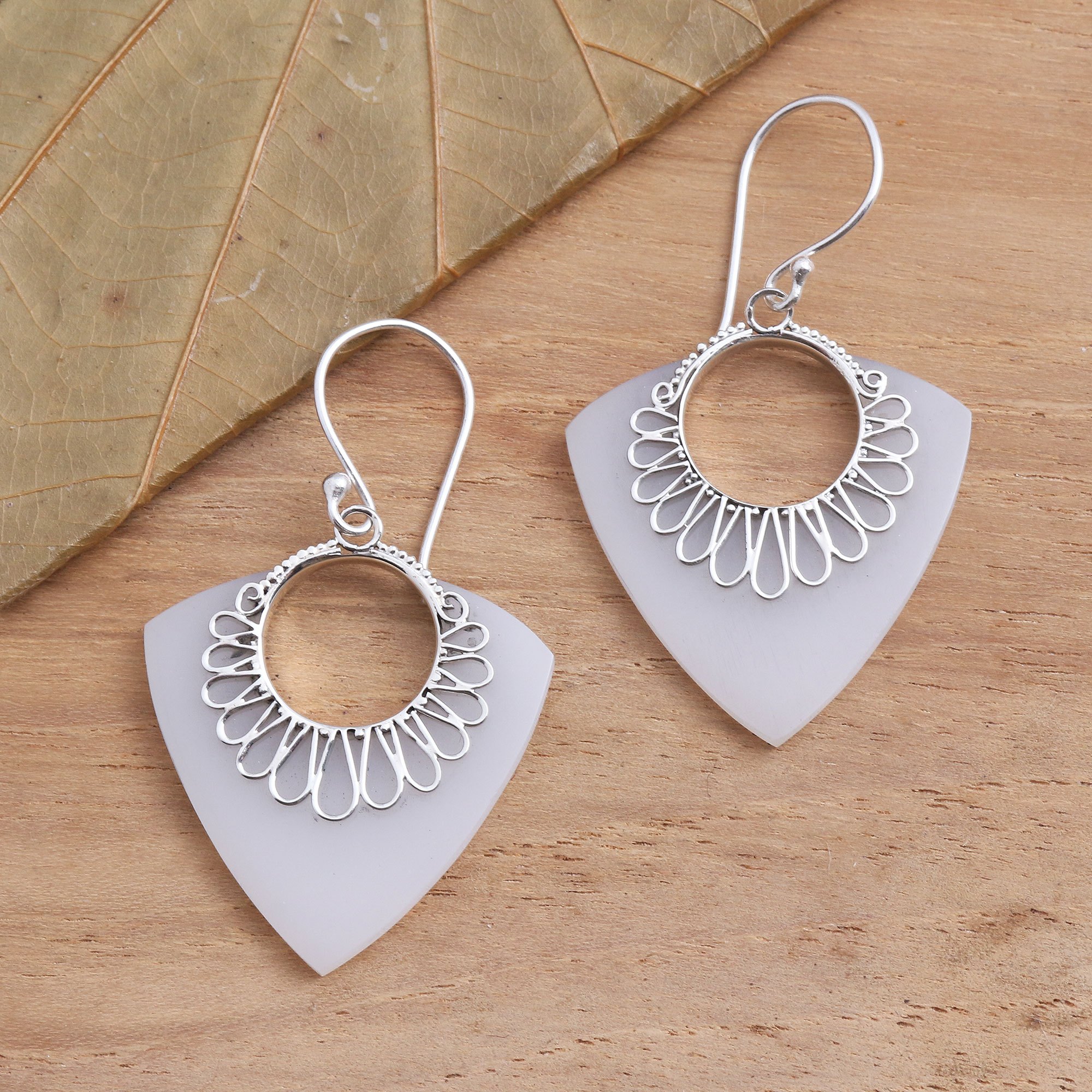 Growing up in the renowned silversmithing village of Celuk in Bali, artisan Kadek Satya was exposed to jewelry making from an early age. Here she presents an original earring design, featuring smooth arrow shapes made of resin that are set in sterling silver wire bezels shaped like flower petals. The earrings swing from sterling silver hooks.