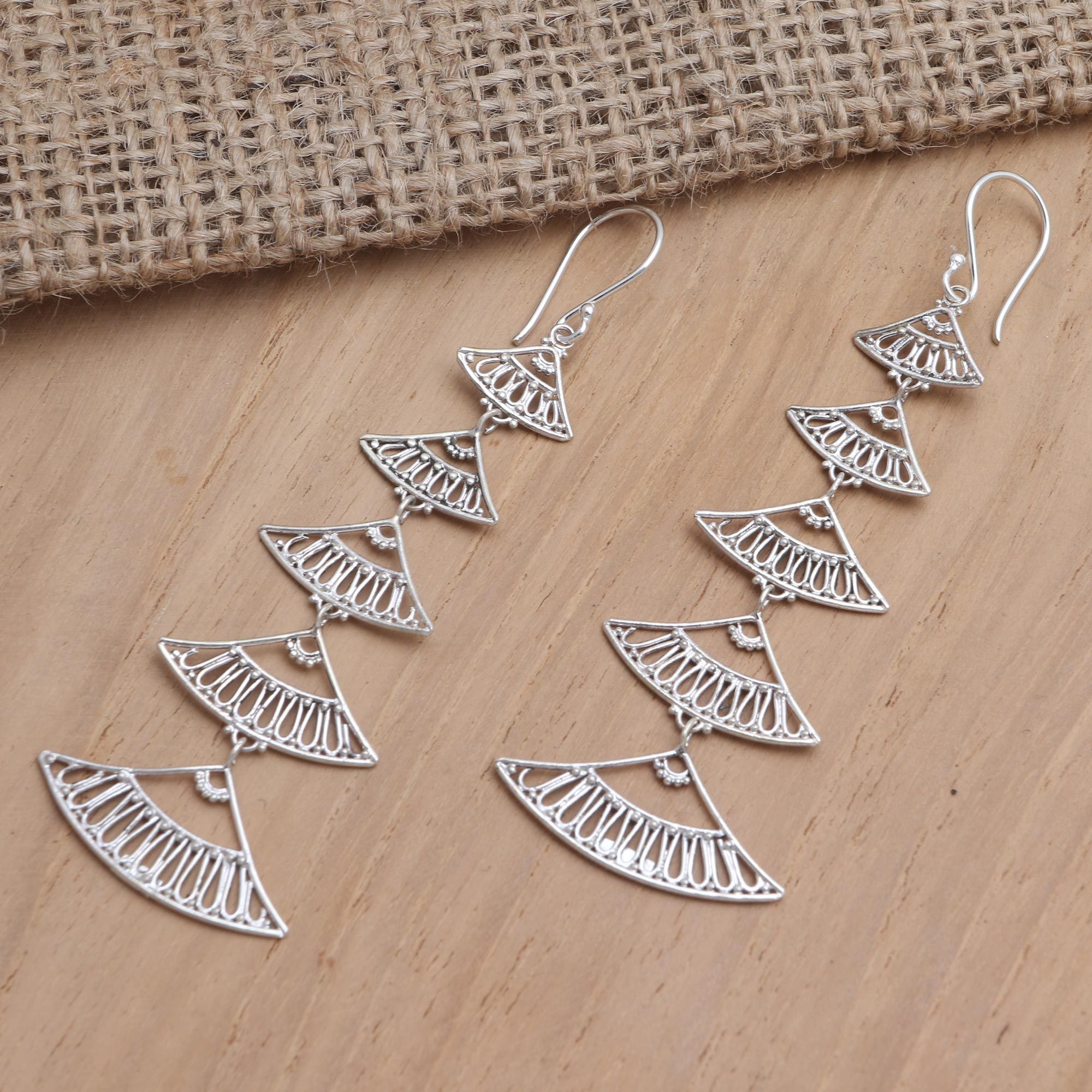 Bali's Ketut Sulastri designed these tiered dangle earrings with inspiration from a classic cooling method: The hand fan. The artisan crafts five sterling silver fan shapes in ascending order for each earring, hanging the pieces from a pair of silver hooks.
