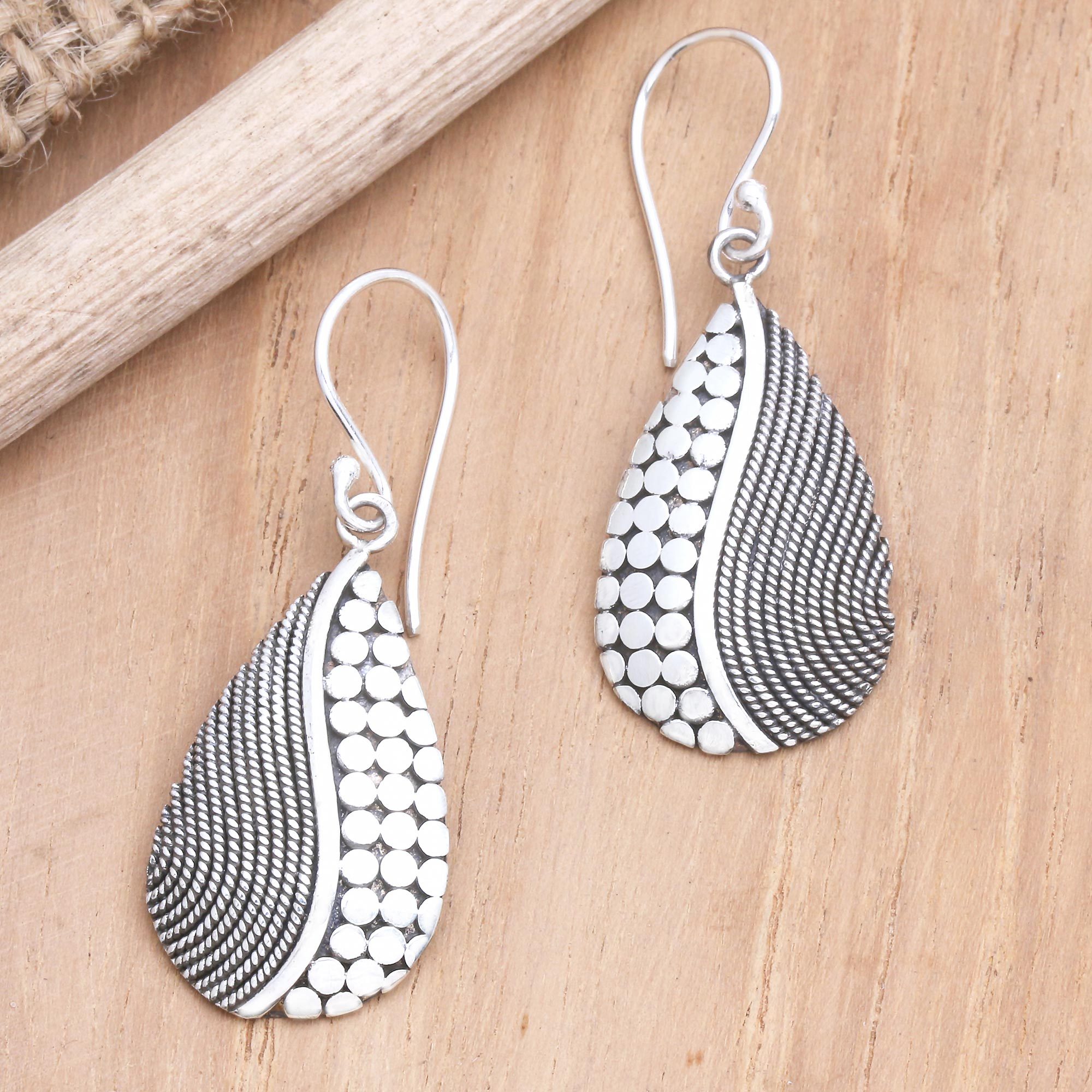 A bold dot motif collides with a silky swirl pattern on Kenari's pair of dangle earrings. Artisans in Bali hand craft the drop-shaped earrings from sterling silver, engraving oxidized waves on one half before accenting the other with polished dots.