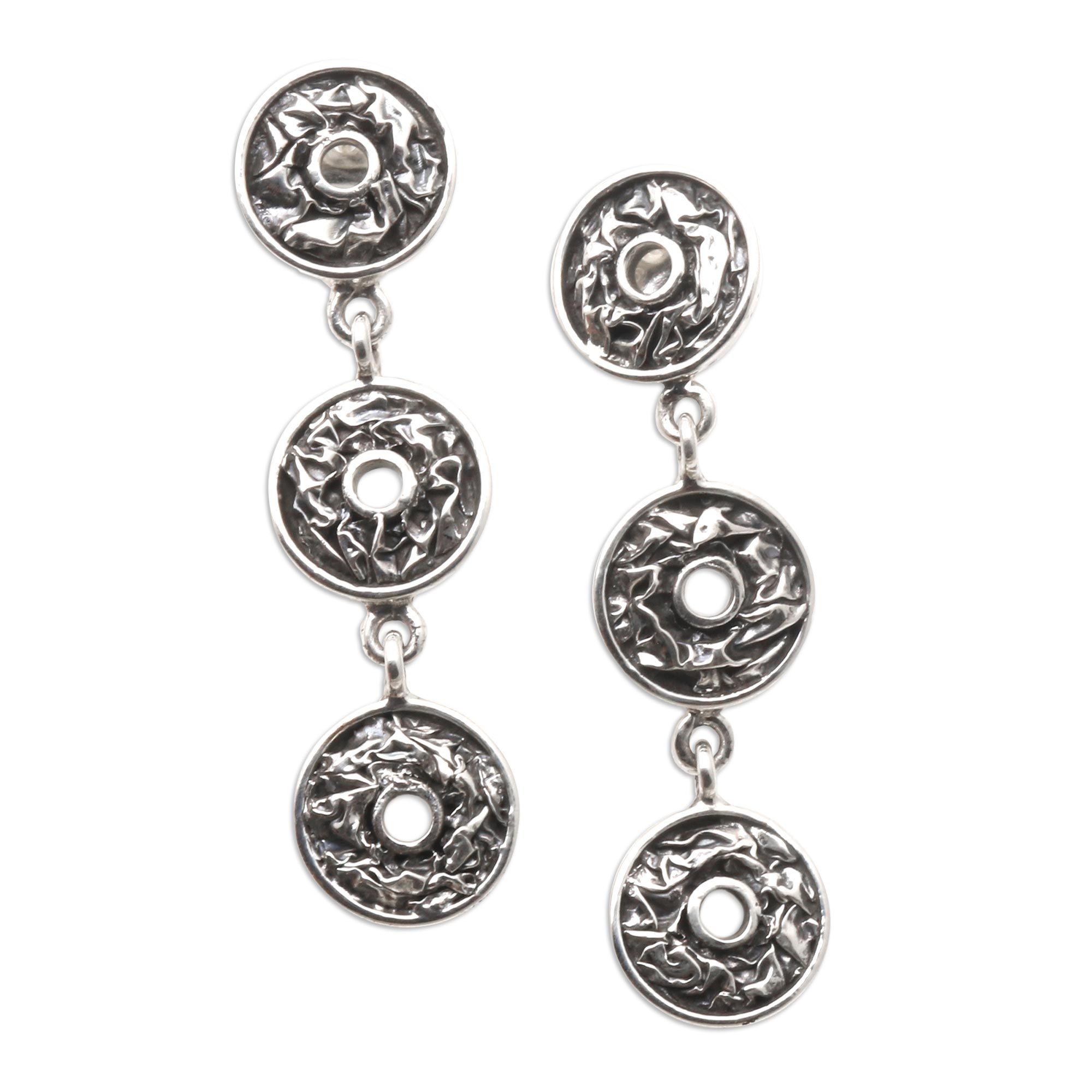 Balinese artisan Anya's beautiful earrings are inspired by the look of ancient coins. The artisan starts by hand crafting three perforated circles from sterling silver, fashioning a crinkled texture that gives the pair an antique appearance.