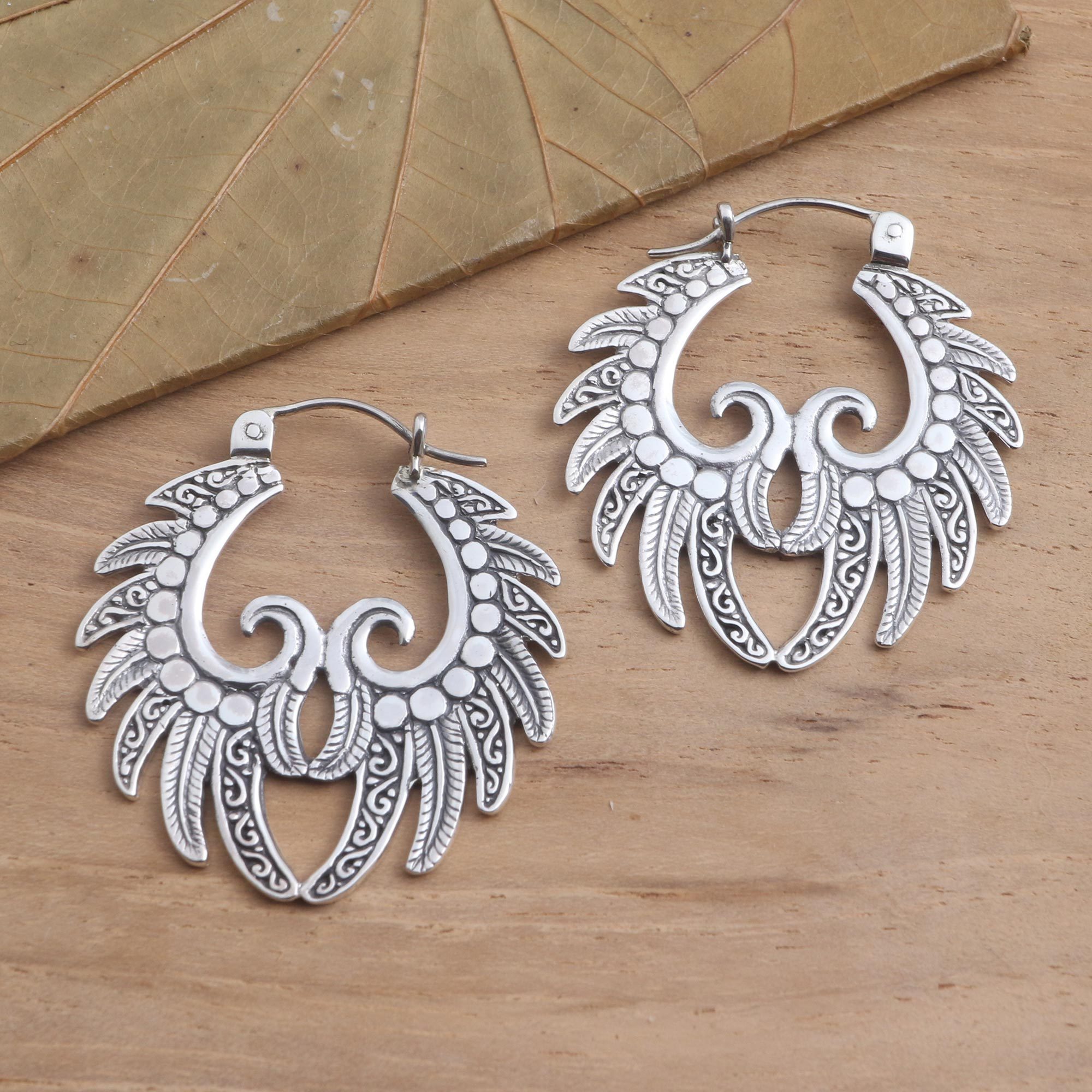 Hand Crafted Sterling Silver Hoop Earrings, 'Feathered Crown'