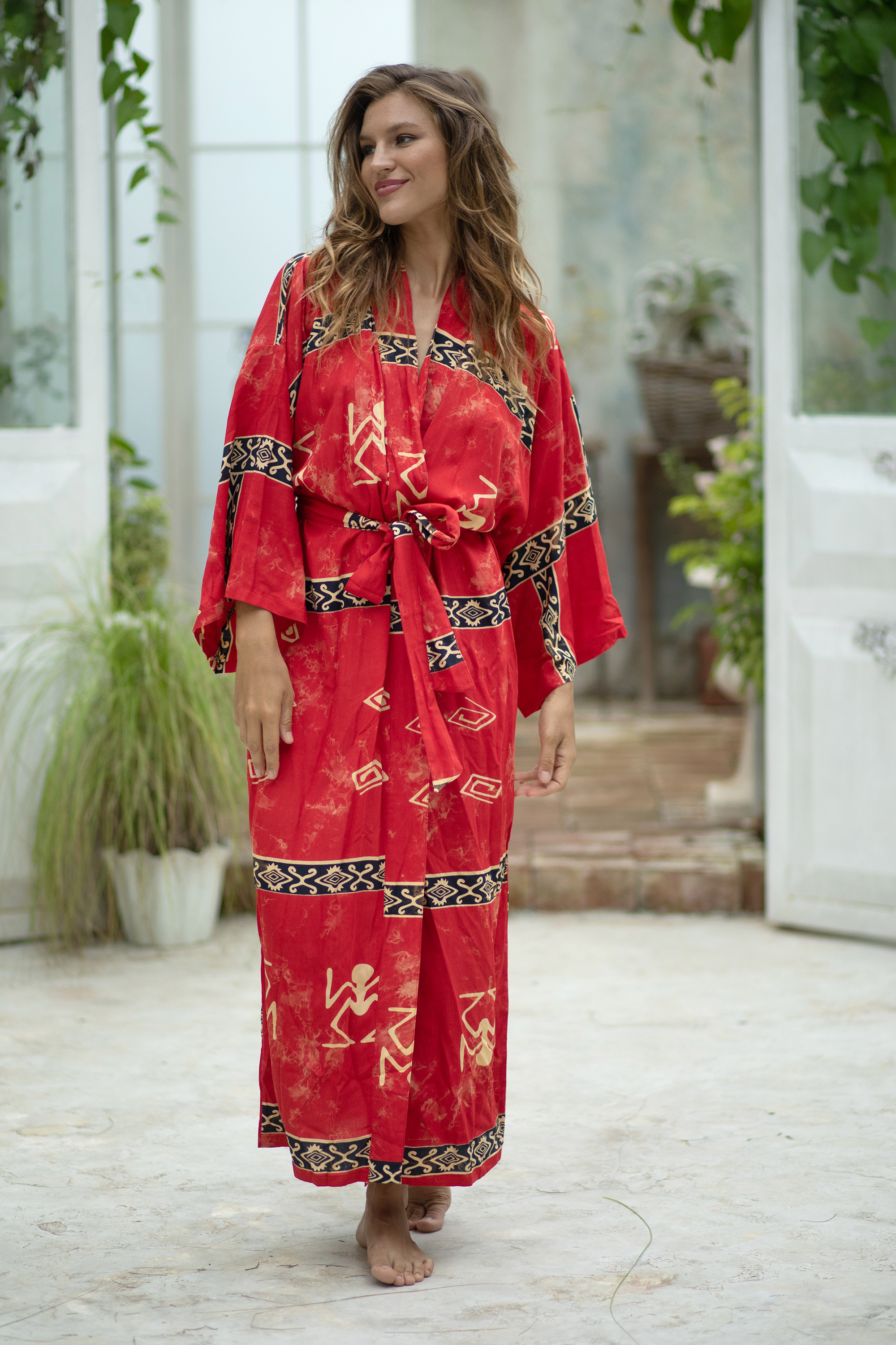 This beautiful robe is painted in stunning ruby red with bands of beige and black. Crafted by Nyoman Nadri from Indonesia, this spectacular piece is created by combining the elements of sunlight, water, dye and temperature. This unique robe will add a beautiful pop of color to your wardrobe and is sure to stand out in your closet.