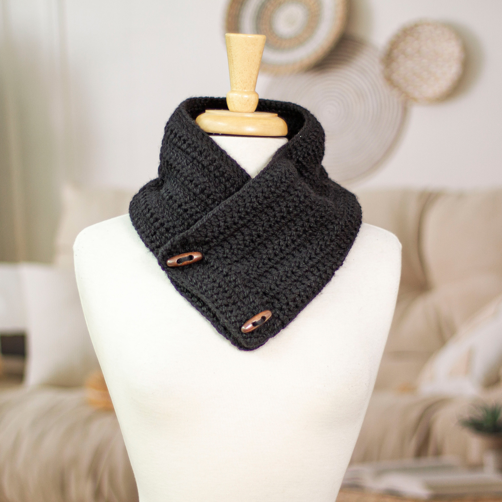 Hand-Crocheted Cotton Blend Neck Warmer in an Onyx Black Hue, 'Warm Ebony'