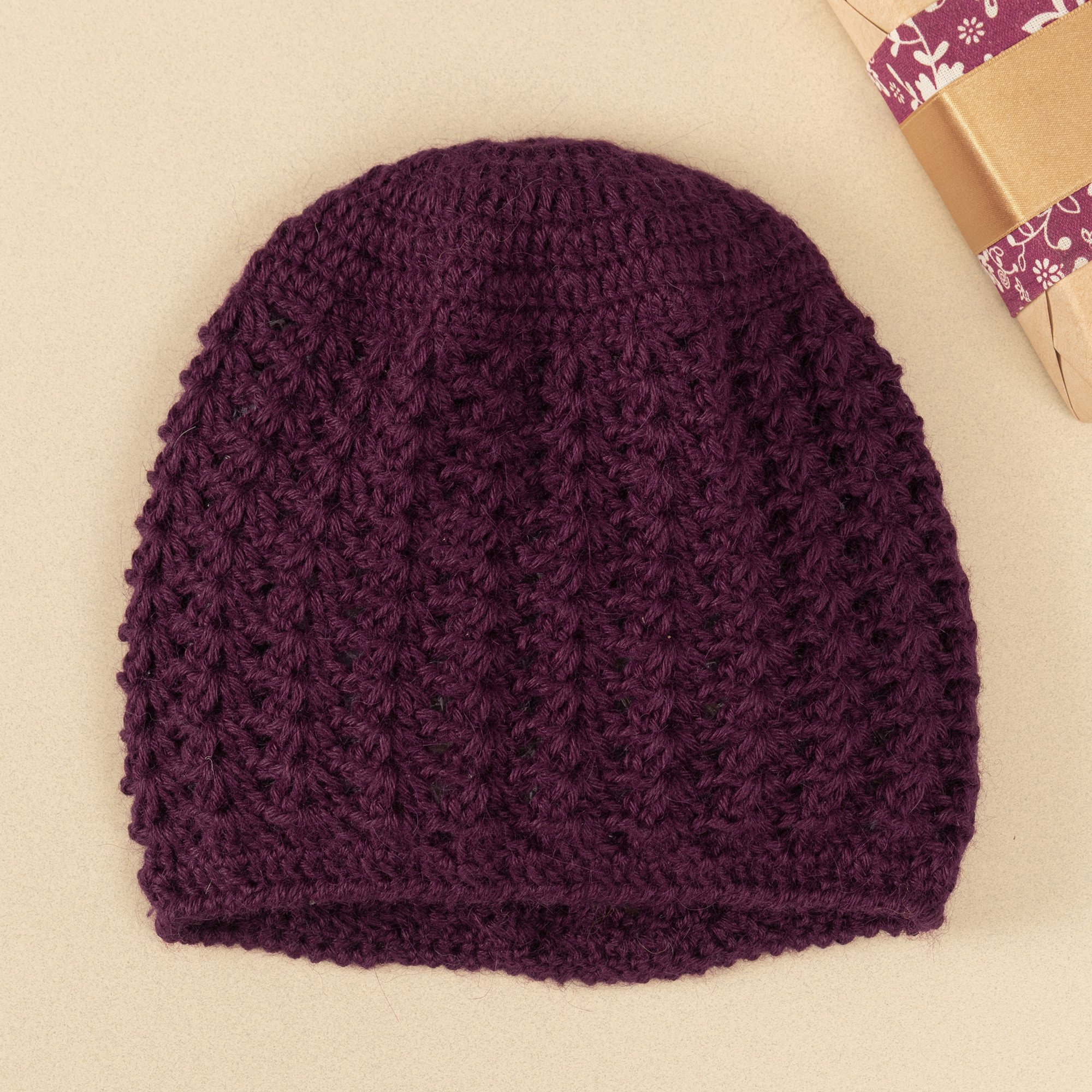 Crocheted by hand from soft 100% alpaca wool yarns, this hat will be your toasty companion all winter long. Artisan Idelsa Guevara in Peru crochets the pretty hat with star-like patterns in deep purple.