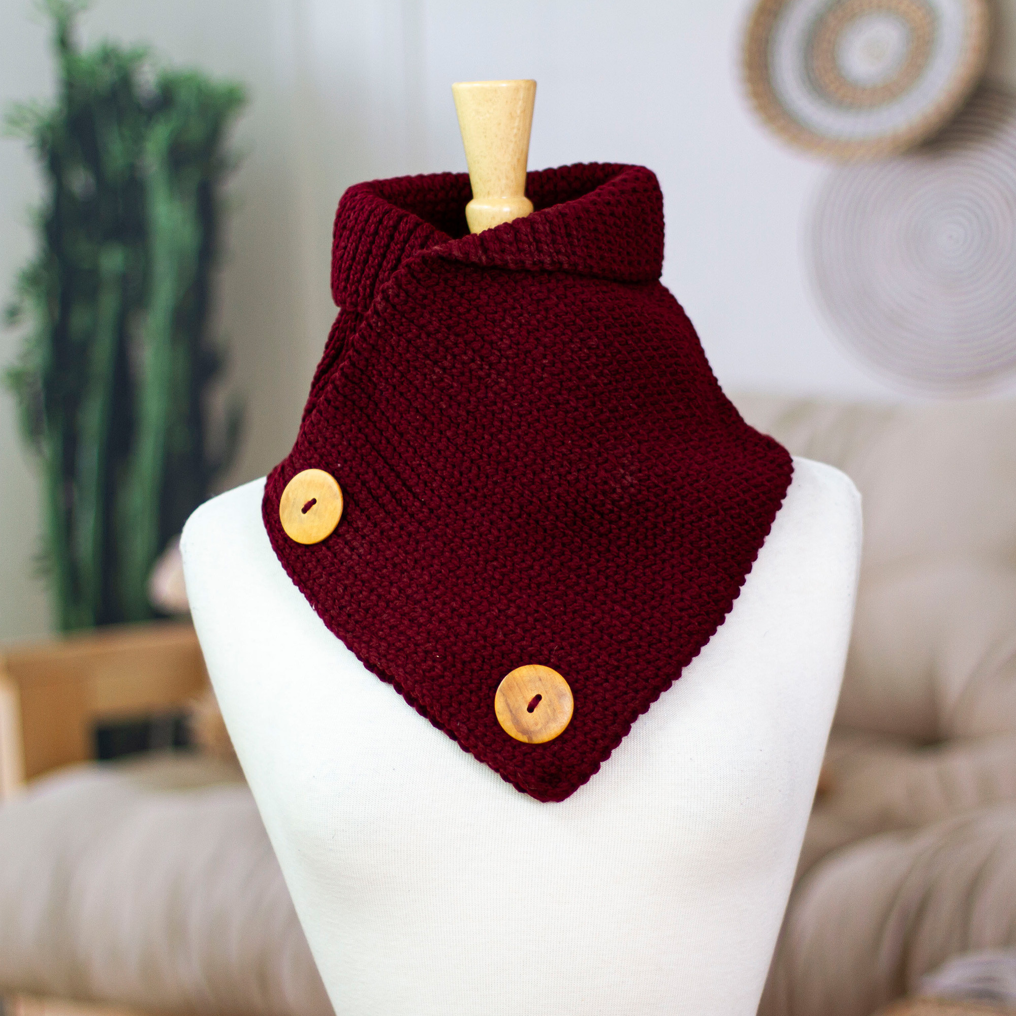 Working with cotton and polyester blend yarns in rich wine red, Martha Fonseca in Mexico crafts this cozy neck warmer. The collar-style neck warmer is crocheted by hand and features two large wooden buttons to secure it around the neck.