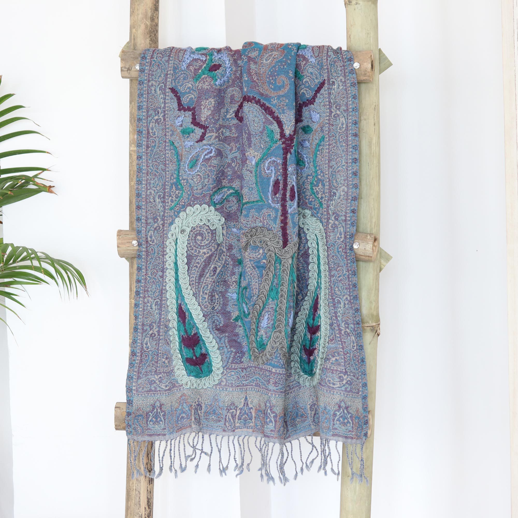 Hand-Embroidered Wool Shawl with Paisley Motif, 'Icy Paisley'