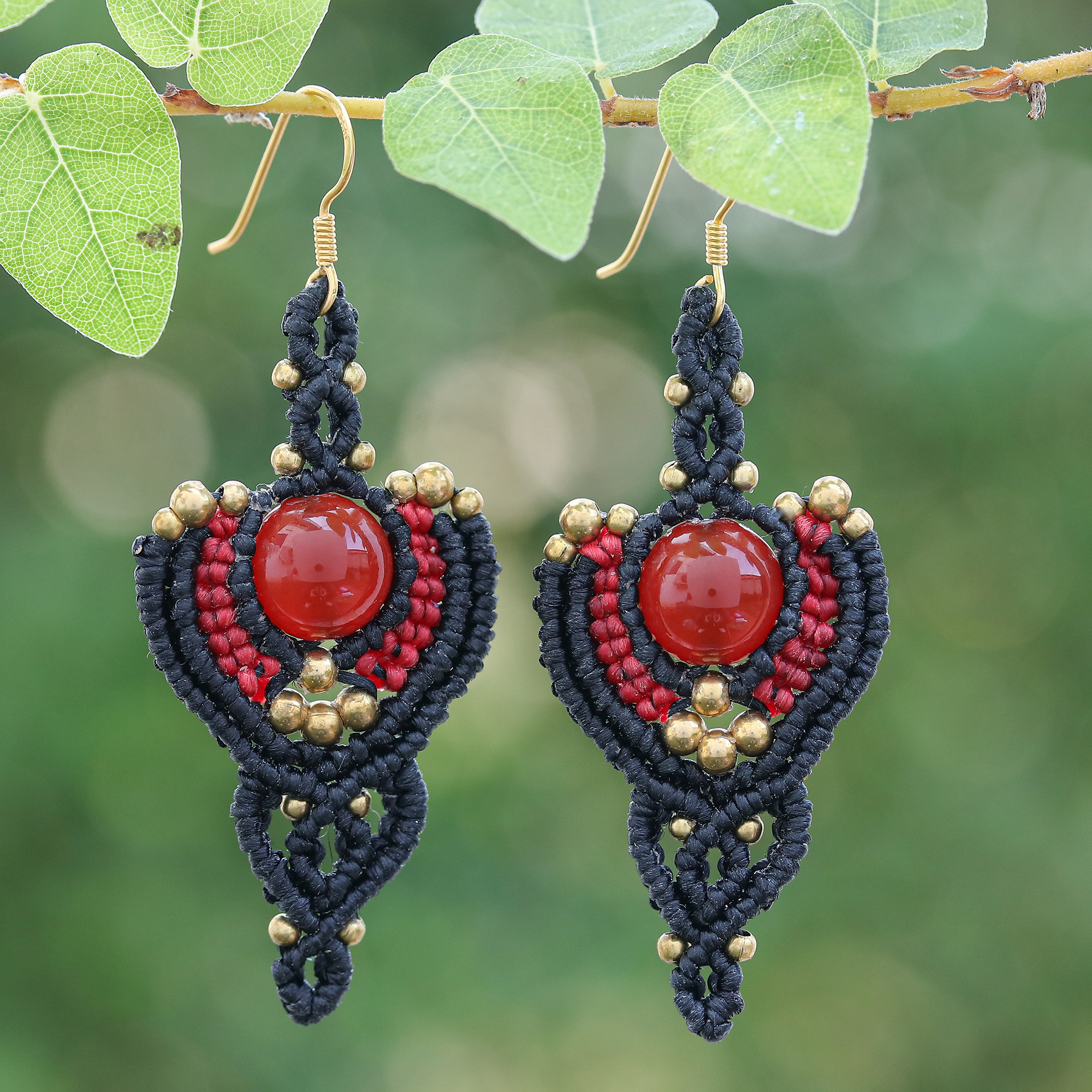 Master Thai artisans infuse your days with the fiery art of courage, contained in the hand-knotted accents that compose these macrame dangle earrings. Showcasing the region's classic elegance, Chaloemphon's pair spreads its waxed dark braids around brass beads and carnelian stones, letting intense red sparks shine alongside 18k gold-plated hooks.