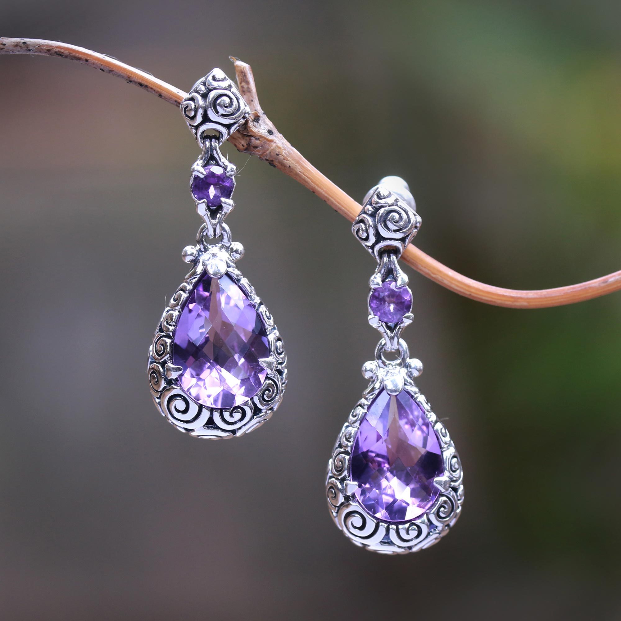 Hand Made Amethyst Dangle Earrings from Indonesia, 'Glistening Buddha's Curls'