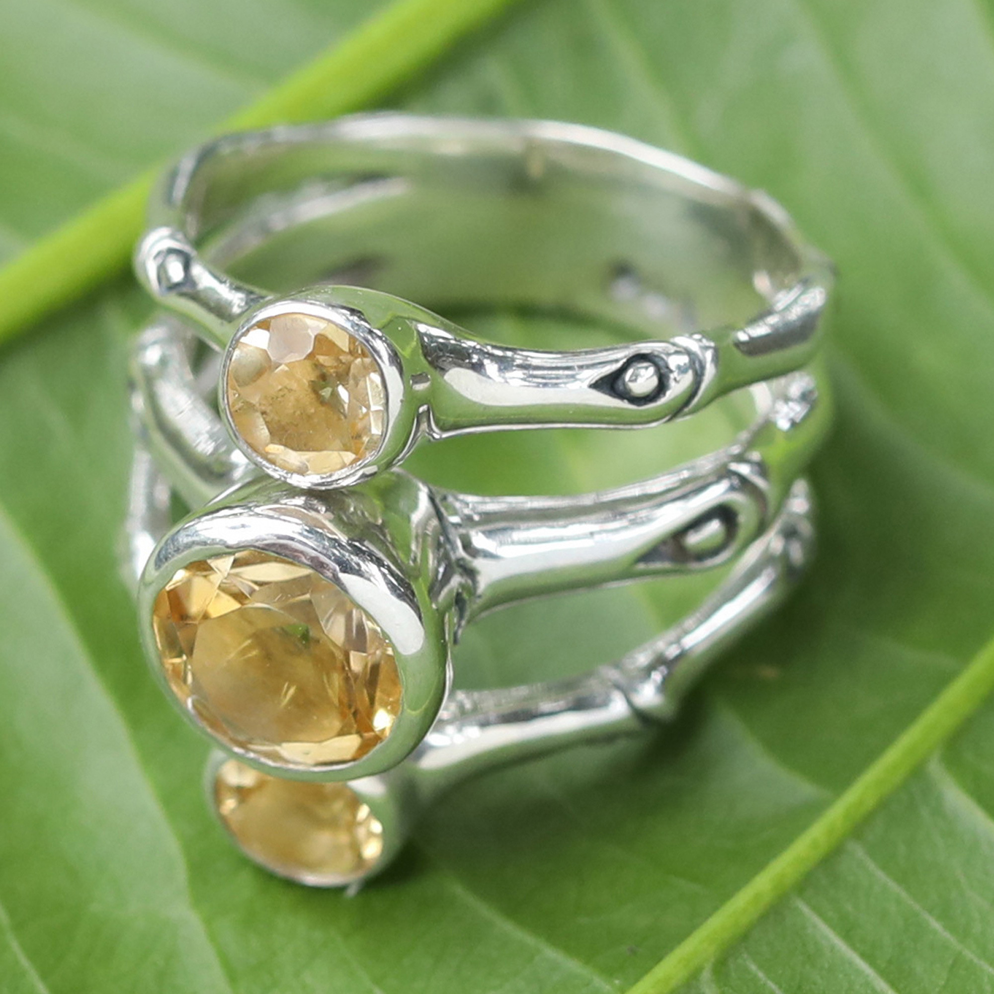 Over two carats of sparkling citrine stones rest atop the open bands of this multi-stone ring by Nyoman Ariawan. Handcrafted from sterling silver in the shape of bamboo stalks, this elegant piece captures the beauty of a dewy forest on an Indonesian morning.