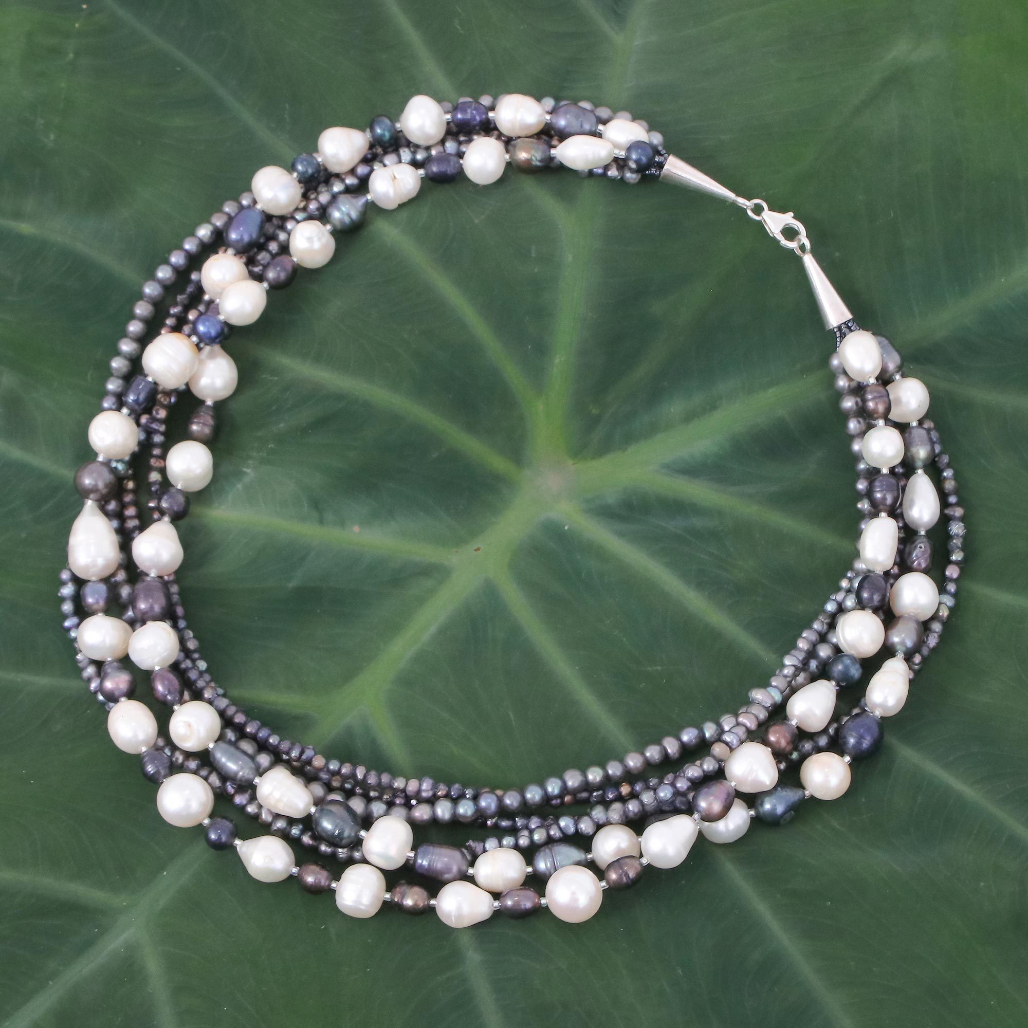 Six strands of white and black pearls create a study in contrasts on Sukanya Thongperm's pretty necklace. Thai artisans use cultured freshwater pearls in natural white, dyed grey, and iridescent black to craft the six strands. Petite, silver-colored glass beads and a sterling silver lobster claw clasp finish the necklace with shining details.